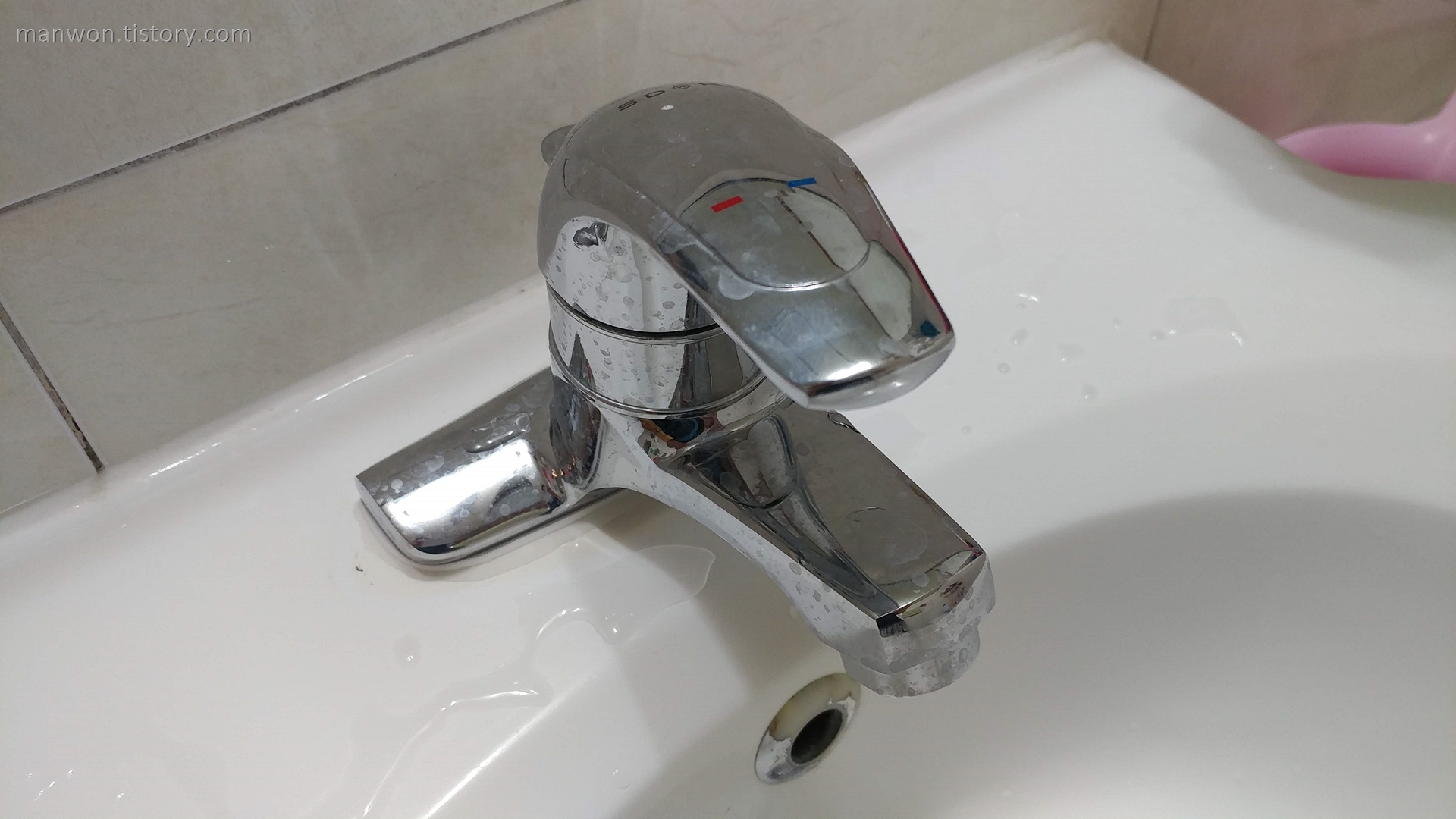인터넷으로 검색을 해보니, 이런 경우 세면대 수전(수도꼭지)과 거기에 연결된 냉수, 온수 고압호스의 고무패킹이 낡아서 생기는 문제일 확률이 높았다.