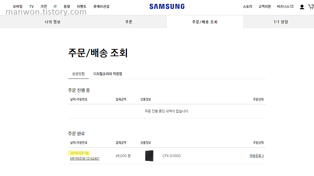 공기청정기 두 대를 집에서 가동하고 있다. LG 공기청정기 필터는 지난 2월에 이미 교체했고, 삼성 공기청정기 필터는 지난 3월에 주문했다. 그런데 아래 사진에서 보다시피, 3월 18일에 삼성전자 공식 홈페이지에서 주문한 필터를 4월 20일이 넘어서야 받을 수 있었다.