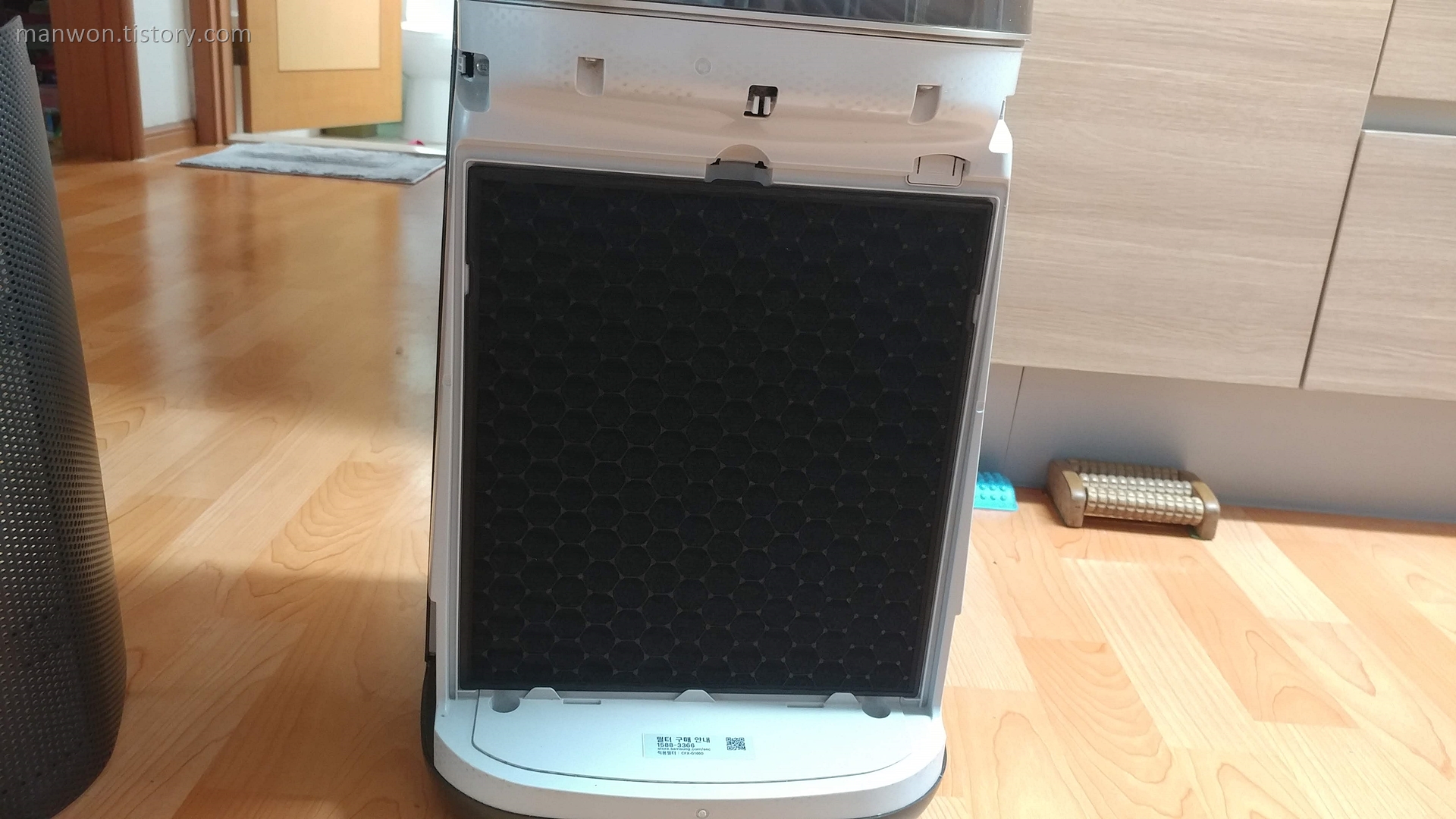 앞에 검은 부분이 숯 탈취필터, 뒤에 흰 부분이 헤파필터.