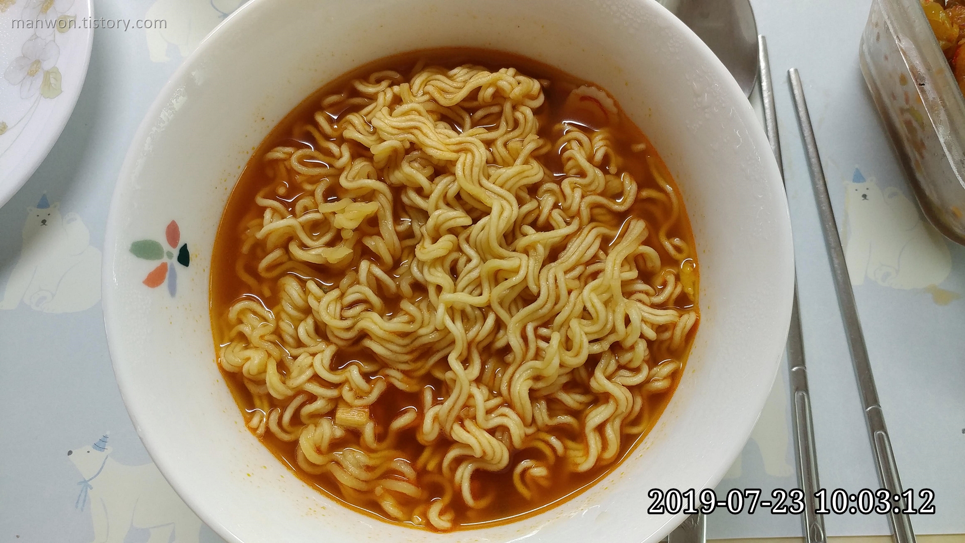 일단 얼큰한 라면으로 시작했다. 사발면인데 그릇에서 익혔다.