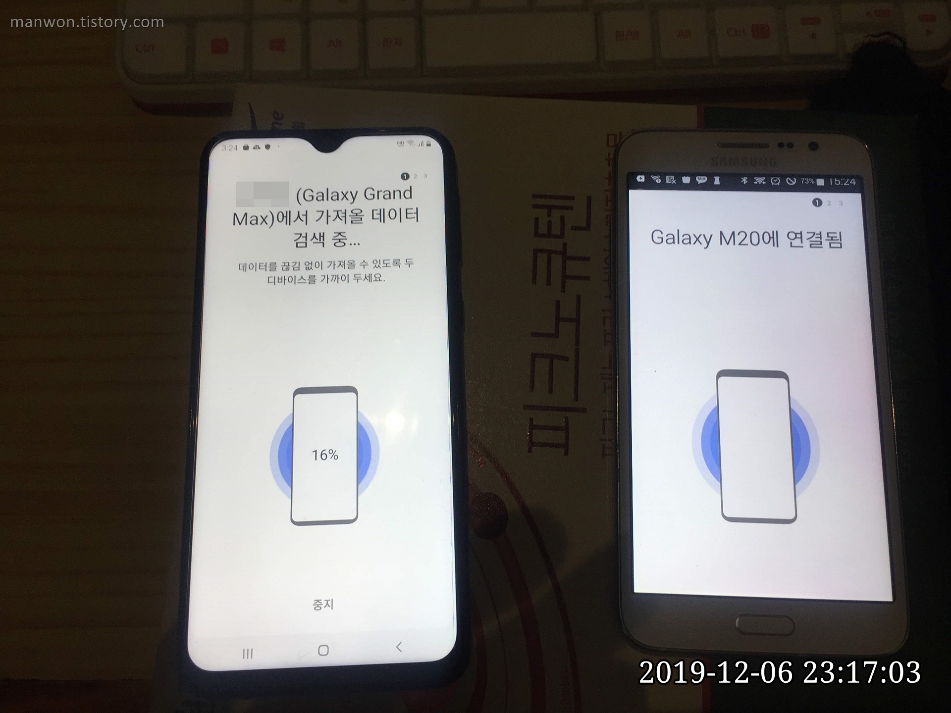 집으로 와서 갤럭시 그랜드 맥스에서 갤럭시 M20으로 연락처, 사진, 앱 등으로 전송하고 있는 사진이다. 삼성 스마트 스위치 모바일이라는 앱을 스마트폰에 각각 설치한 후 다이렉트 와이파이로 전송하는 건데, 어찌 된 일인지 시간이 한참 지나도 진행이 되지 않아서 포기하고 그냥 어머님이 이전에 쓰시던 앱을 하나하나 재설치했다.