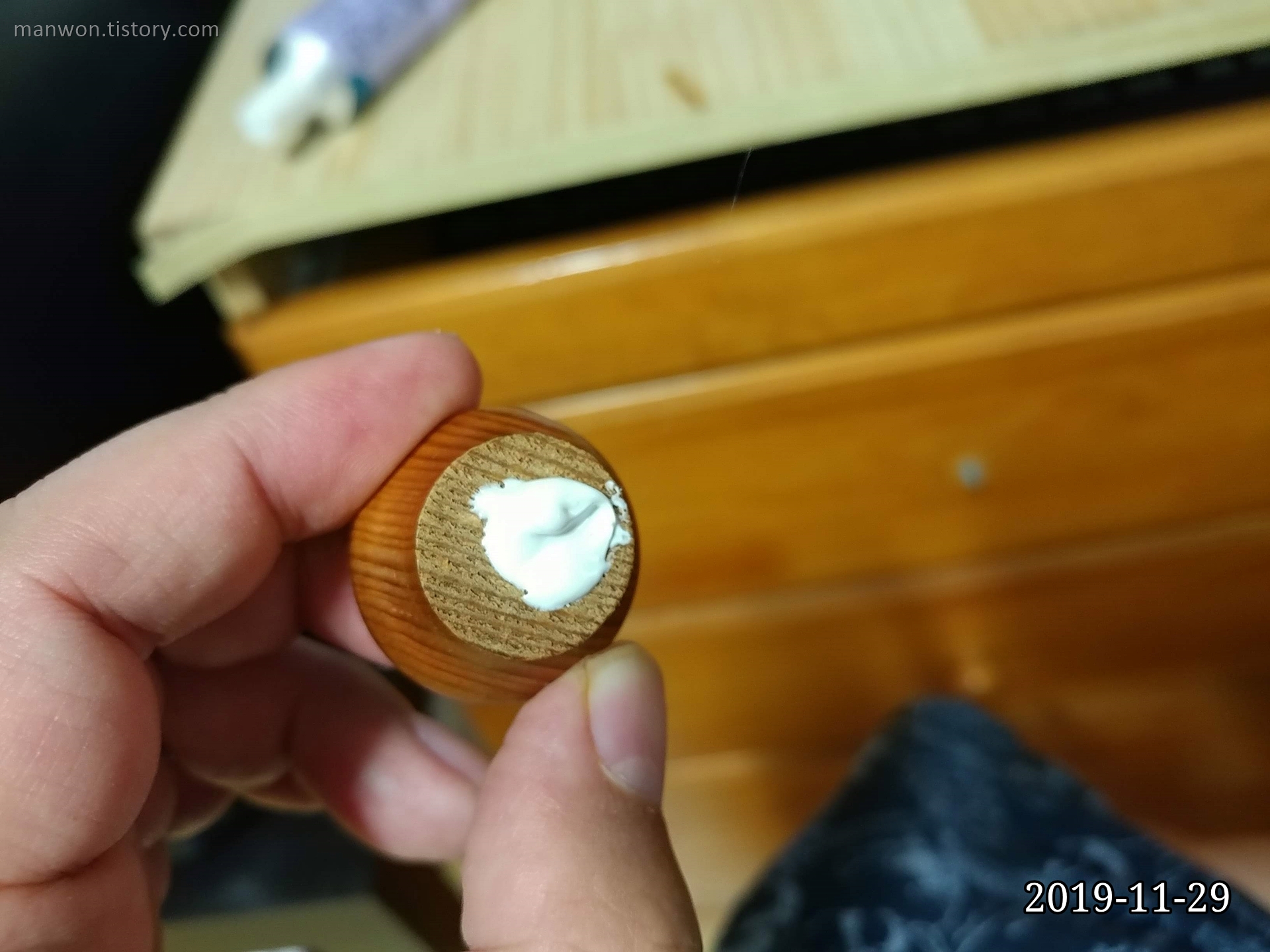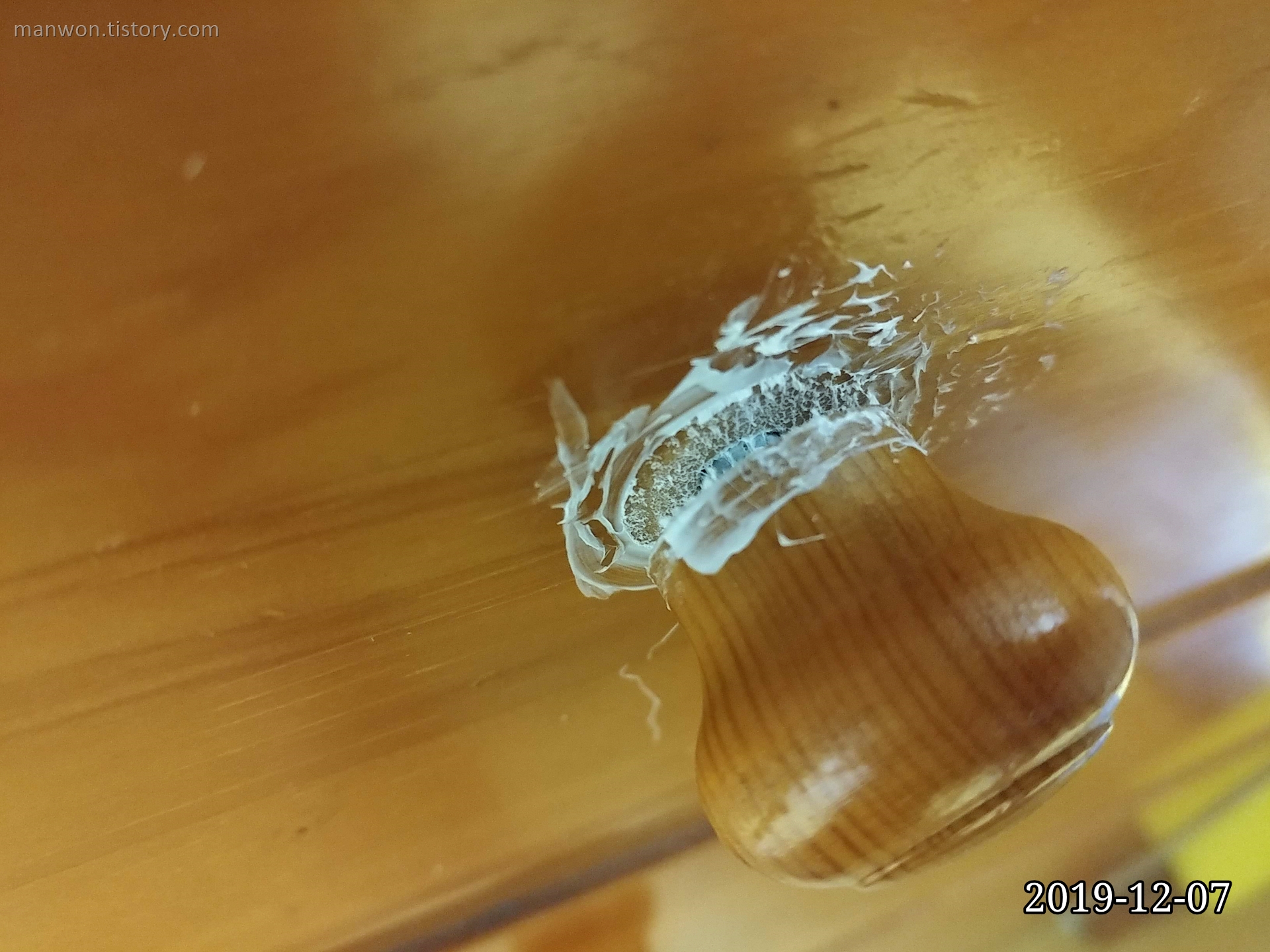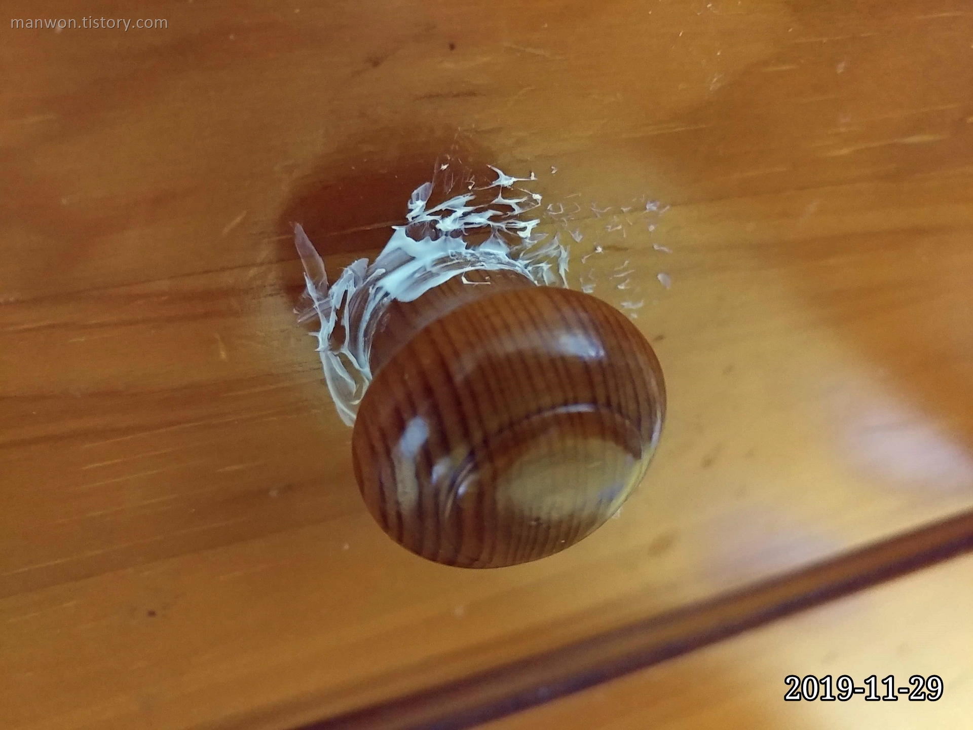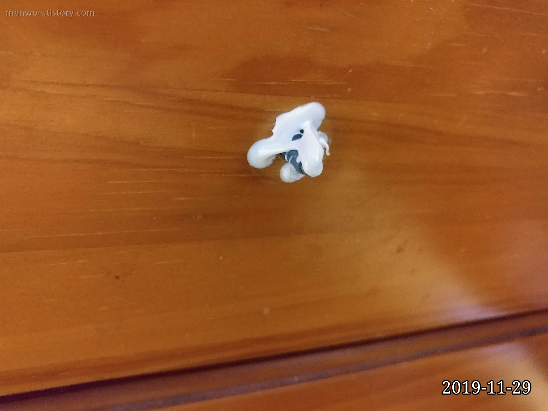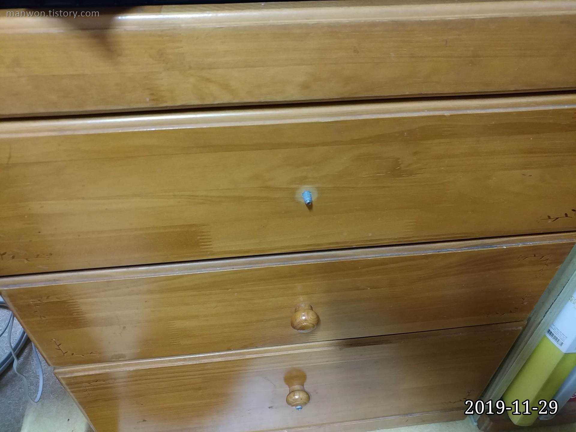 8일 정도 지난 오늘 위 사진처럼 서랍 손잡이가 다시 떨어졌다. 정신을 가다듬고 다른 방법을 찾아야겠다.