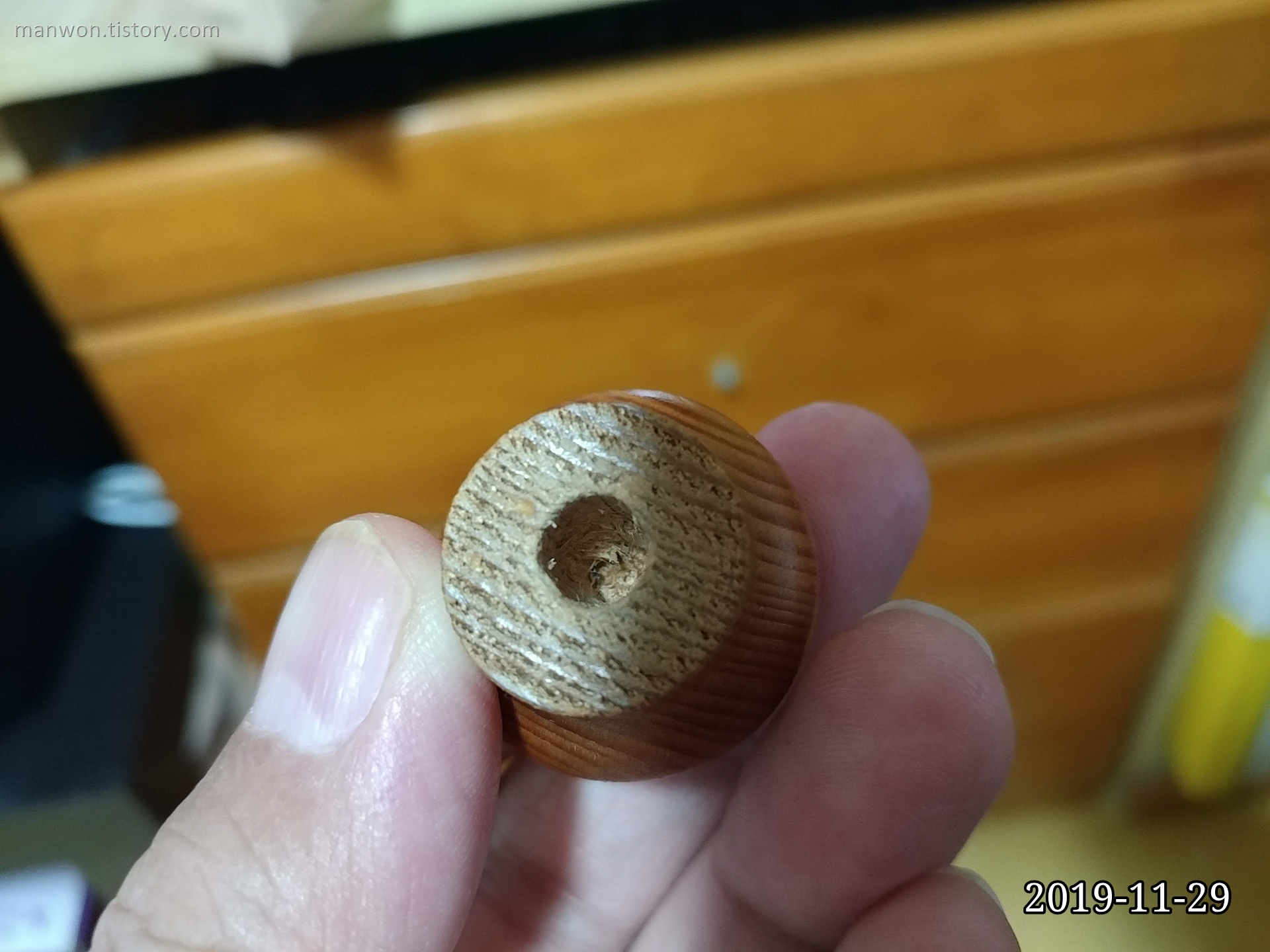 떨어진 서랍 손잡이를 보니 쉽게 표현해서 안쪽이 허벌이 난 상태. 나사와 접하는 부분이 단순히 나무이기 때문에 이런 건 오래 사용하면 손잡이 안쪽이 닳아서 떨어질 수밖에 없는 구조다.