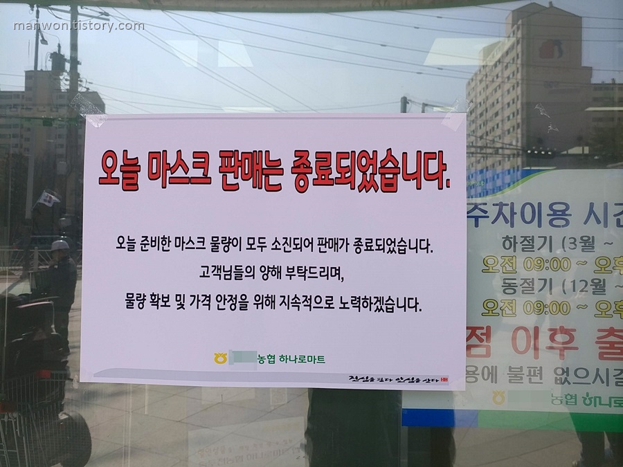 어제 2시부터 동네 하나로마트에서 마스크를 판매한다고 해서 방문했습니다. 1시 50분 정도에 도착을 했는데 위 사진처럼 이미 마스크 판매는 종료가 된 상태였습니다. 몇 시부터 판매를 한 건지, 혹시 미리 판매를 한 건 아닌지 자초지종을 듣고 싶어서 안으로 들어갔는데요....