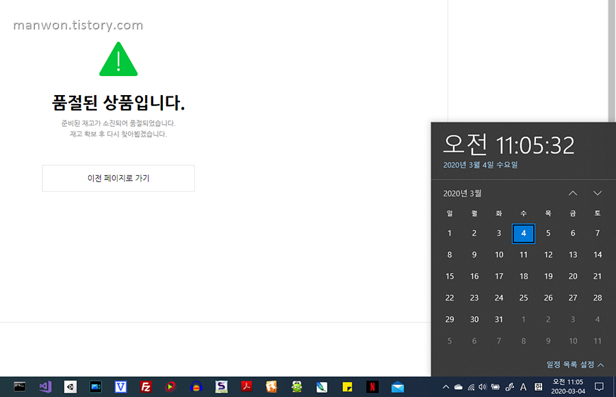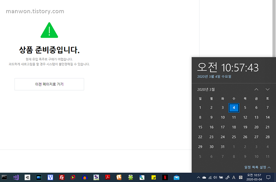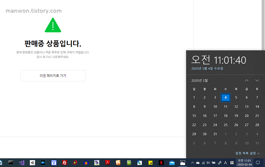 11시 1분입니다. 오~ 오늘은 그래도 판매중 상품이라는 메세지가 정확히 나오네요. 어제까지는 그냥 접속이 폭주해서 정상적인 진행이 안된다는 식으로만 나왔거든요.