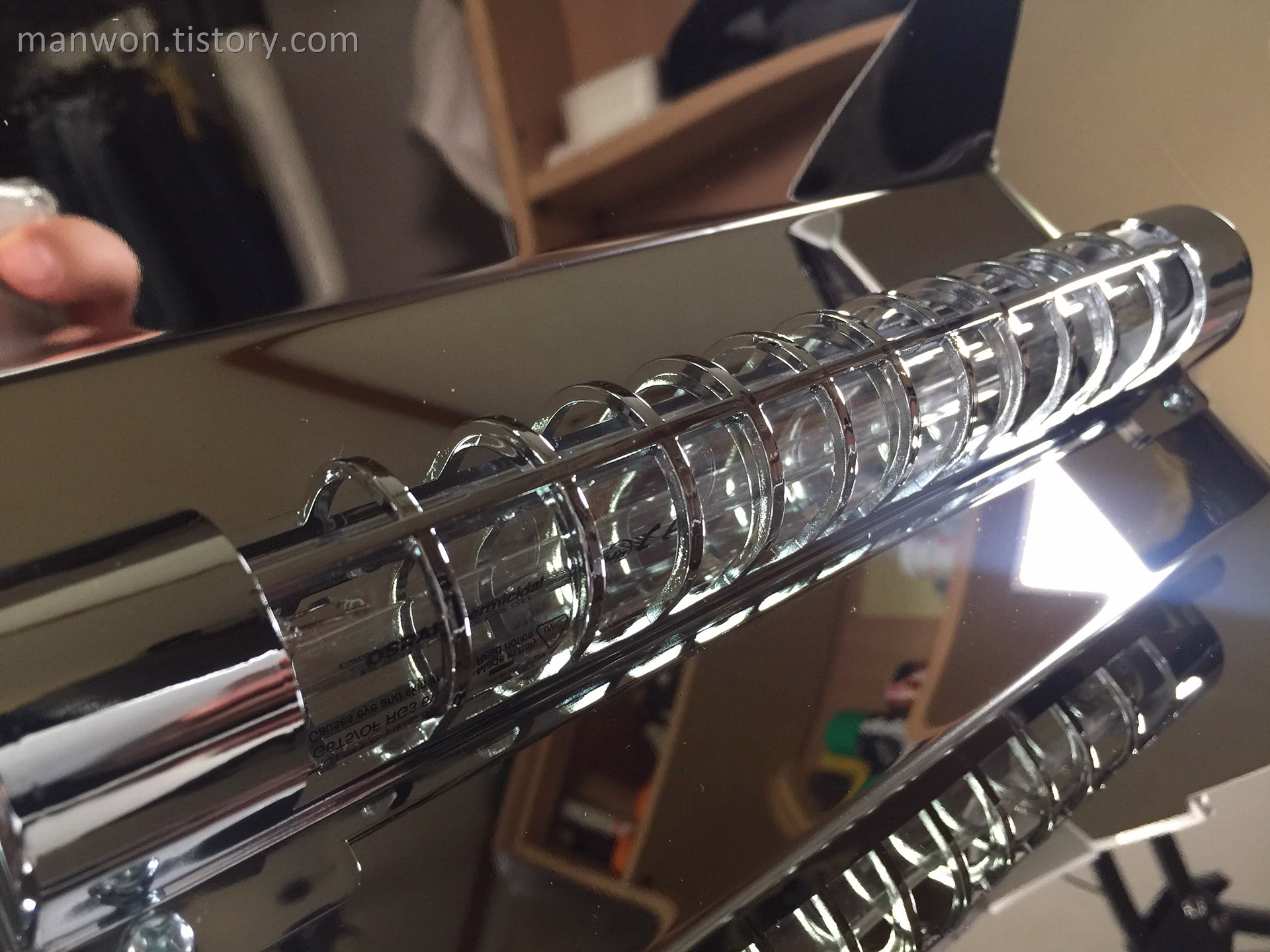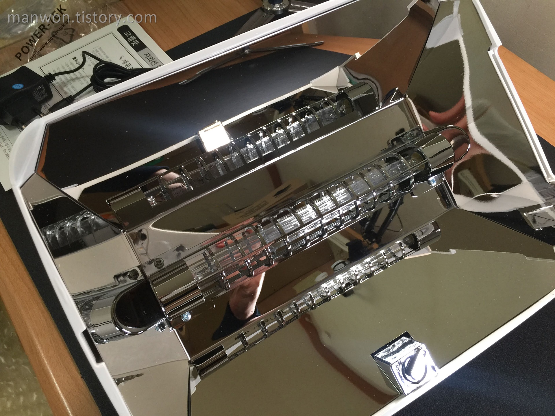 가장 중요한 안쪽 부분입니다. 가운데 UV-C램프가 있고 그 주위를 은색 테두리가 보호하고 있네요. 또한 주변 전체가 거울처럼 반사되는 재질입니다. 아마도 자외선 광선이 대상물에 골고루 조사될 수 있도록 한 조치 같네요.