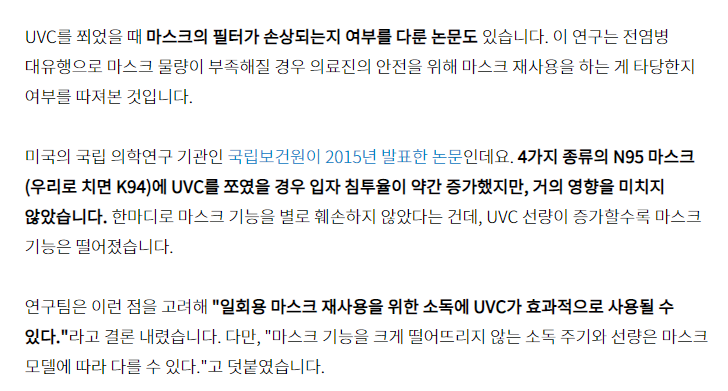 이 부분은 UVC를 쬐었을 때 마스크 필터가 손상되는지에 대한 부분입니다. 읽어 보시면 UVC로 소독했을 때 마스크 필터의 기능이 아주 약간 떨어지기는 하지만 거의 신경 쓰지 않아도 될 정도라고 나와 있고 맨 밑의 굵은 글씨에는 일회용 마스크 재사용을 위한 소독에 UVC가 효과적일 수도 있다고 나와 있네요!
