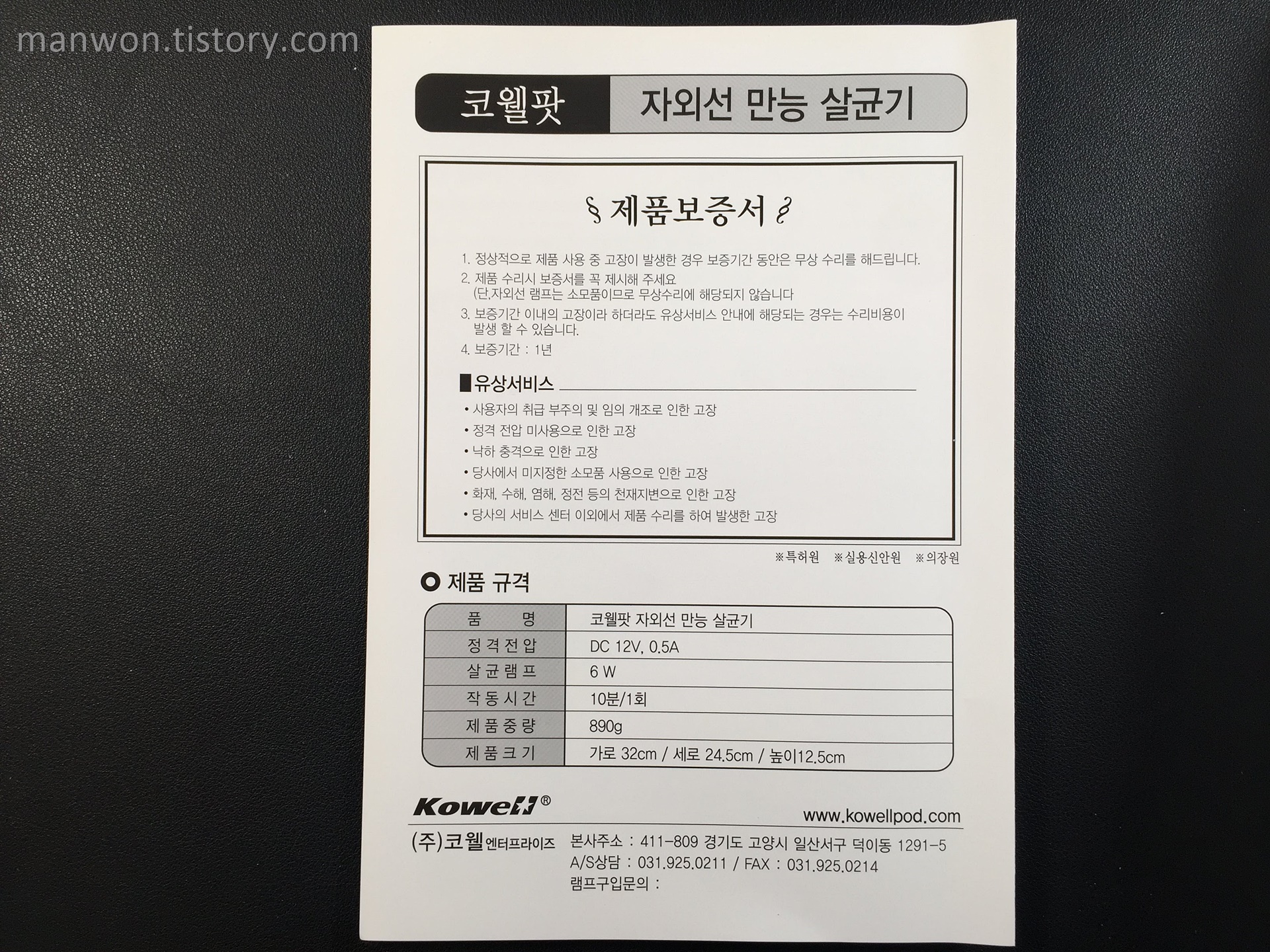 코웰팟 자외선 만능 살균기 제품 보증서.