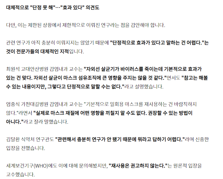 자 이 부분은 아직 단정적으로 효과가 있다고 말하기는 어렵다고 주장하는 부분입니다. 즉 어느 정도 효과는 있다고 보는데, 관련 연구가 충분히 진행되지 않았기 때문에 조심스러운 입장을 취하고 있는 것 같습니다. 세계 보건기구에서도 재사용은 권고하지 않는다고 하지만 제 개인적인 생각으로는 굉장히 조심스럽고 보수적이면서 책임회피를 할 수 있는 멘트를 사용한 것 같습니다. 확실한 연구결과가 나오지 않은 상태에서 자외선 살균기로 소독 후 재사용을 권장했다가 여러가지 문제가 발생하면 세계보건기구 측에서도 골치 아플 수 있을 테니까 말이죠.