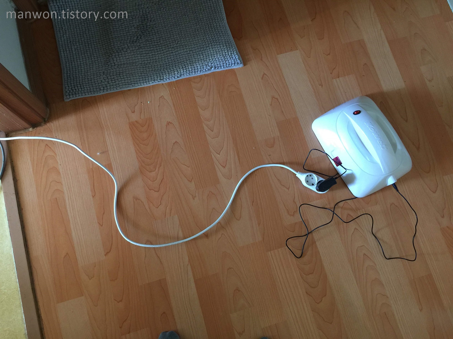 전원 어댑터와 전원 선. 전원 선이 짧은 편은 아닌데, 집안 곳곳을 돌아다니면서 사용하려면 추가로 5m 이상의 멀티탭에 연결해서 사용하면 됩니다.