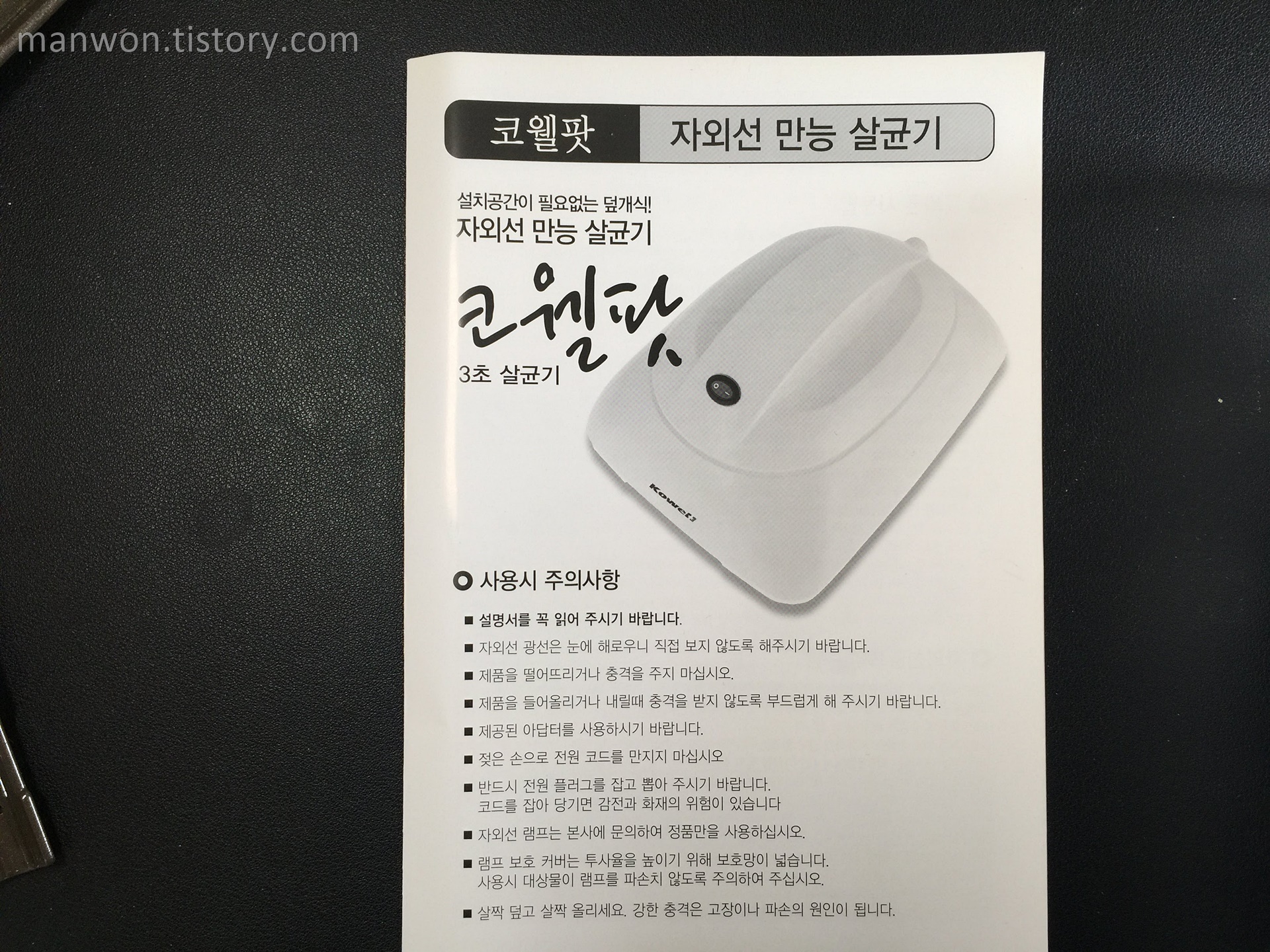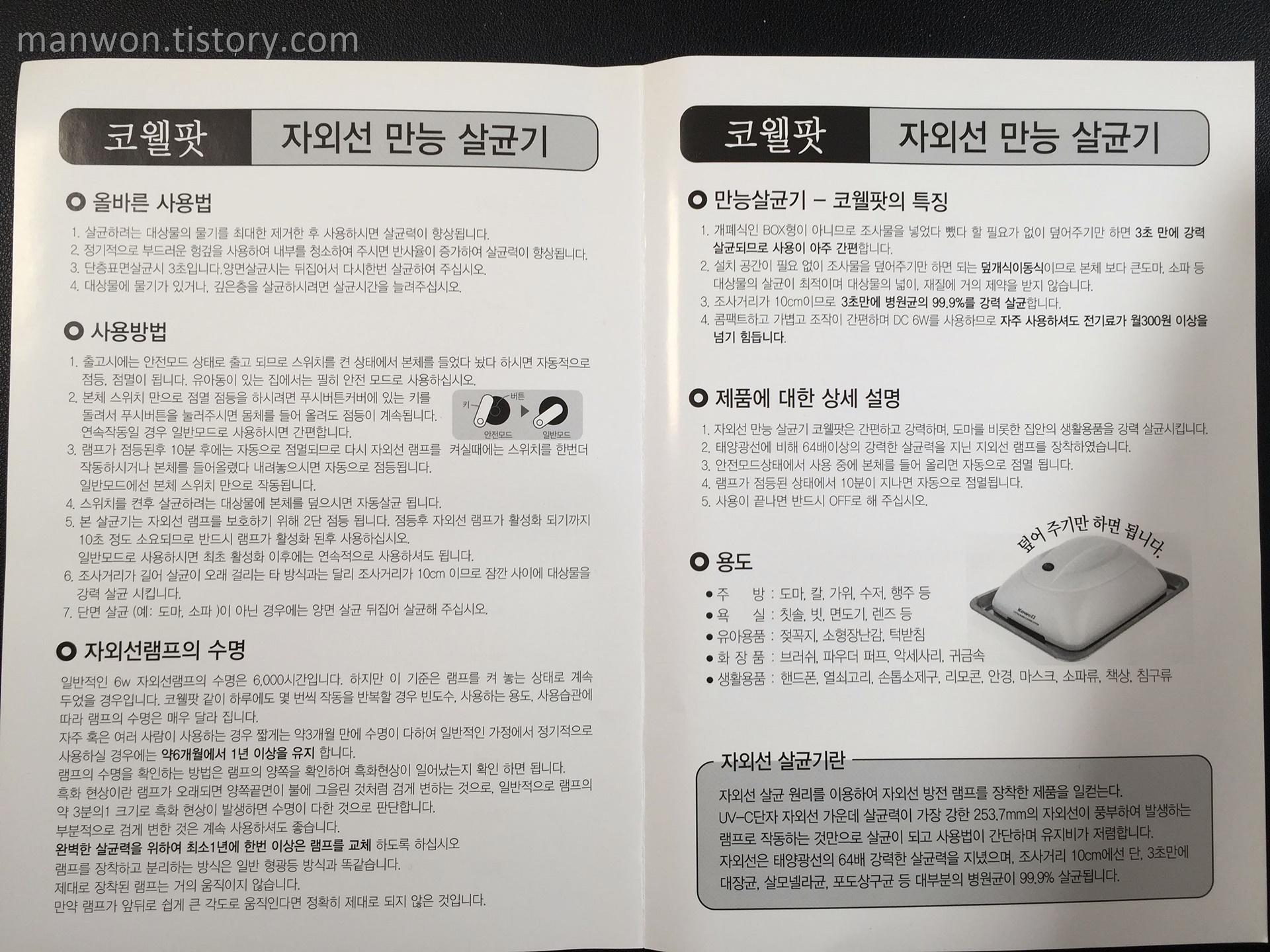 조사거리가 10cm라 3초만에 병원균의 99.9%를 살균한다고 합니다. (오른쪽 페이지 상단 부)