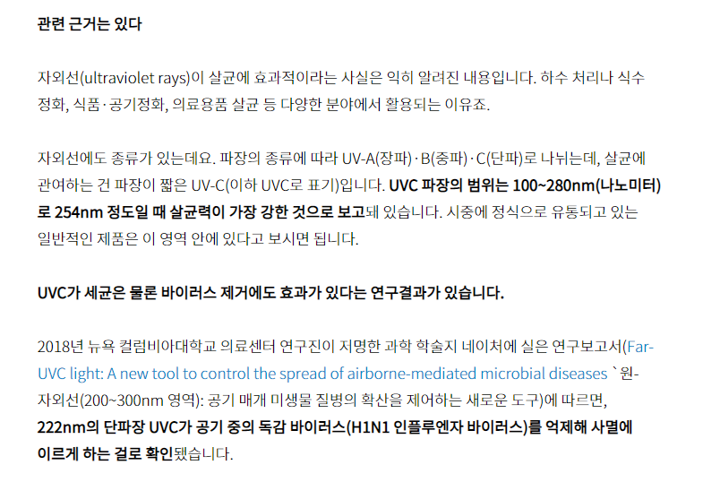 자 이 부분은 과연 UVC가 바이러스 제거에도 효과가 있는지 여부입니다. 위 이미지의 굵은 글씨를 보시면 UVC가 세균은 물론 바이러스 제거에도 효과가 있다고 하죠.