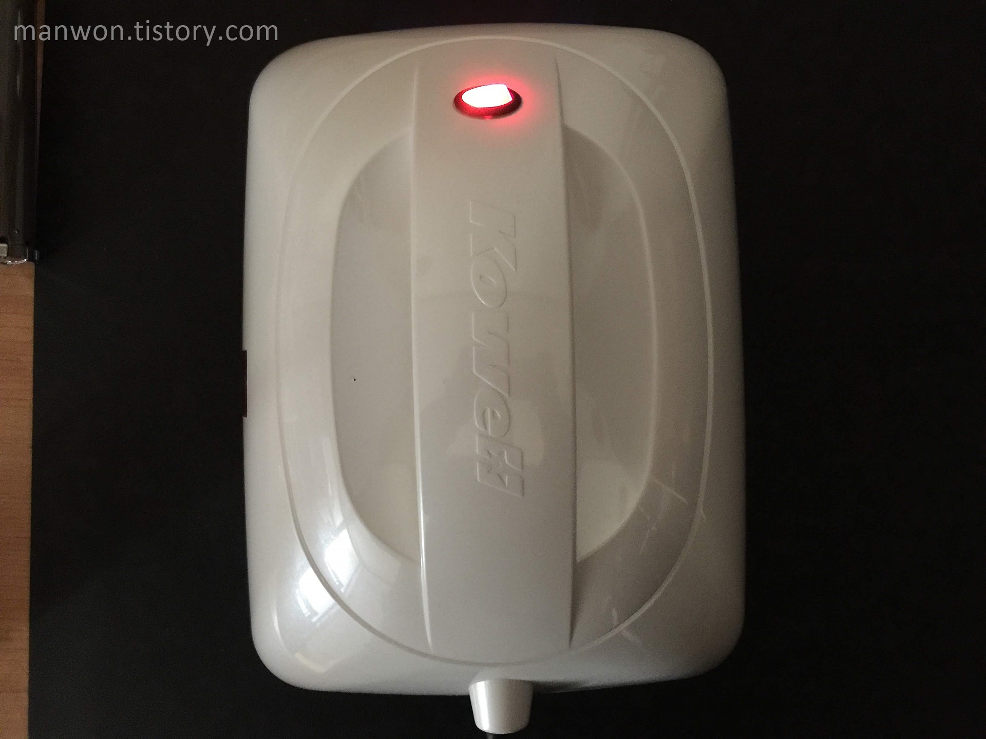 위 사진처럼 푸른빛이 들어옵니다. 제품 윗면 왼쪽 부분이 스위치인데 스위치에 불이 들어온 게 보이시죠. 스위치를 켜고 10초 동안은 준비 상태고 10초 후부터 사용하면 된다고 합니다.
