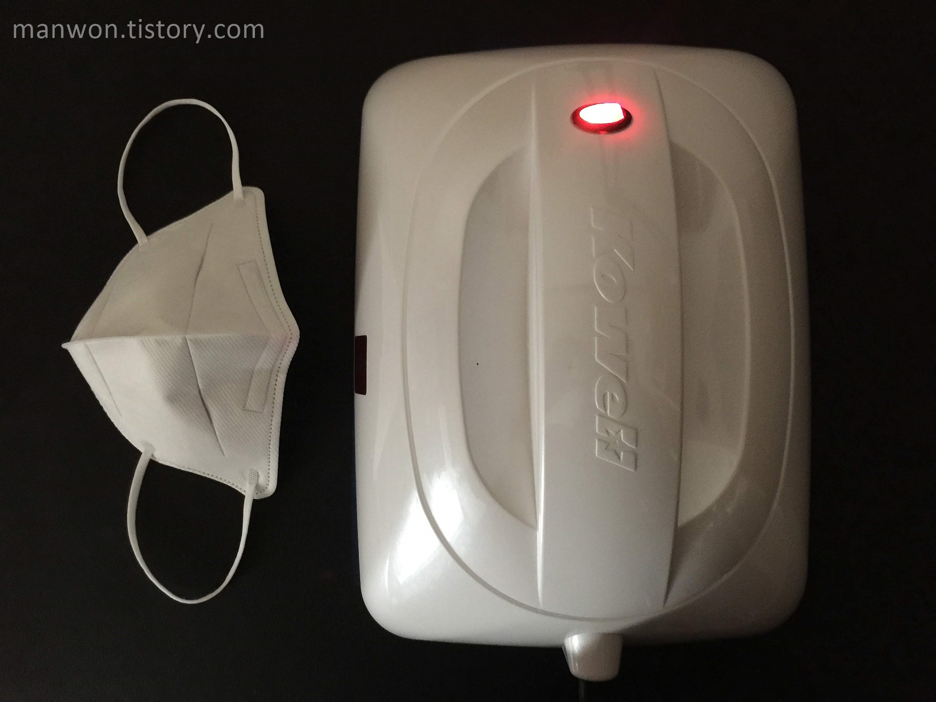 자 이제 각종 물건들을 코웰팟 자외선 만능 살균기로 소독해 보겠습니다. 먼저 KF94 보건용 마스크입니다.