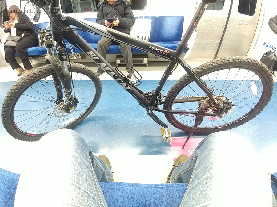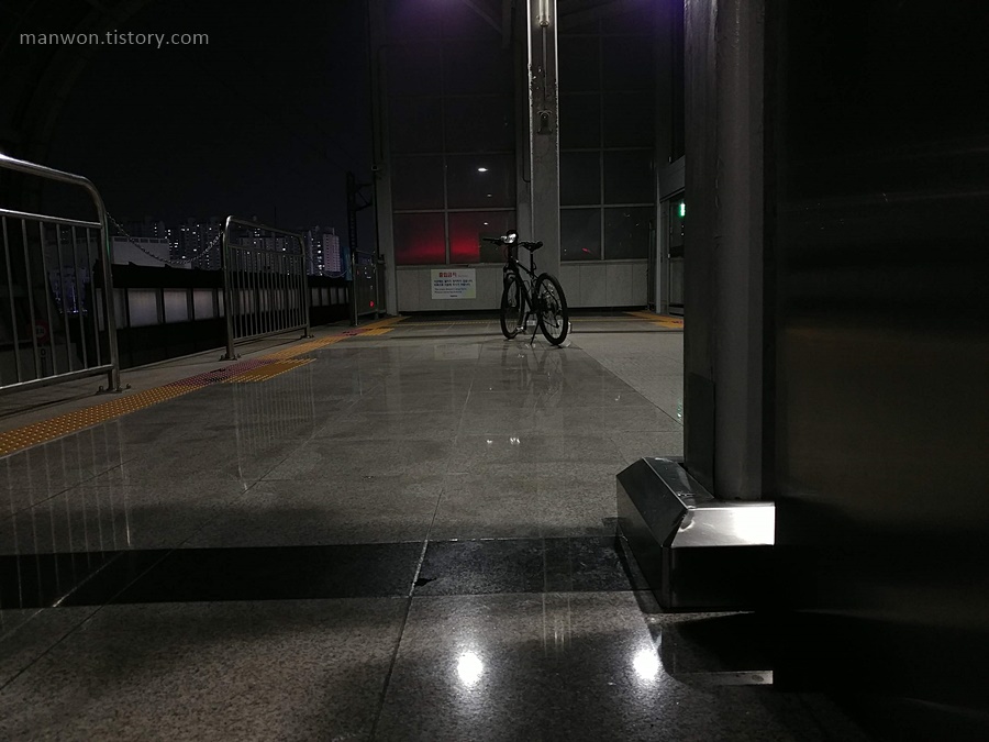 전철을 타고 이동. 일요일 저녁이라 전철에 사람이 거의 없었다. 원래는 전철 칸 한쪽 끝에 자전거를 놓아야 한다. 처음에는 한편에 세워 놓고 자리에 앉았는데, 자꾸 자전거가 넘어져서 그냥 내 앞으로 가져와서 손으로 잡고 이동했다. 전철 안 사람은 점점 더 빠져서 결국 한 칸에 2명만 남은 상태에서 하차했다.