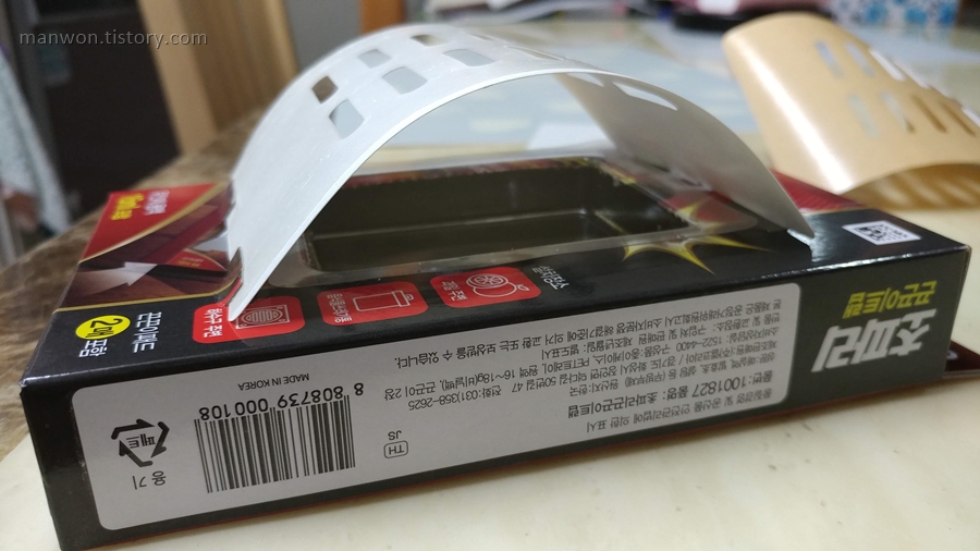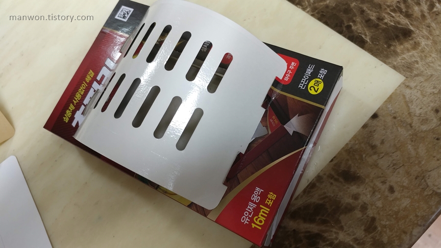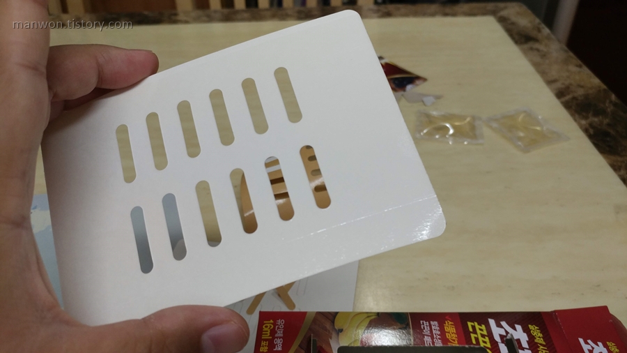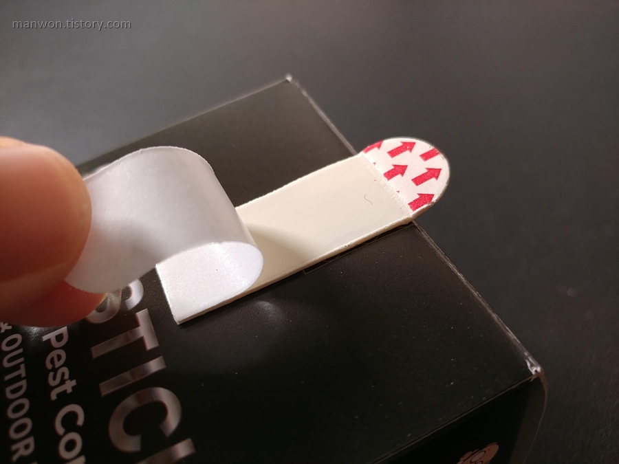 이렇게 겉면을 벗기고 원하는 벽에 붙이면 된다. 참고로 저 위에 화살표 위로 향하고 있는 반원 부분의 겉면은 떼어내는 것이 아니다. 나중에 제품을 다 쓰고 벽에서 떼어낼 때 저 화살표 반원 부분을 잡고 위로 당기면, 벽에 접착 흔적 없이 깔끔하게 떨어지게 된다.