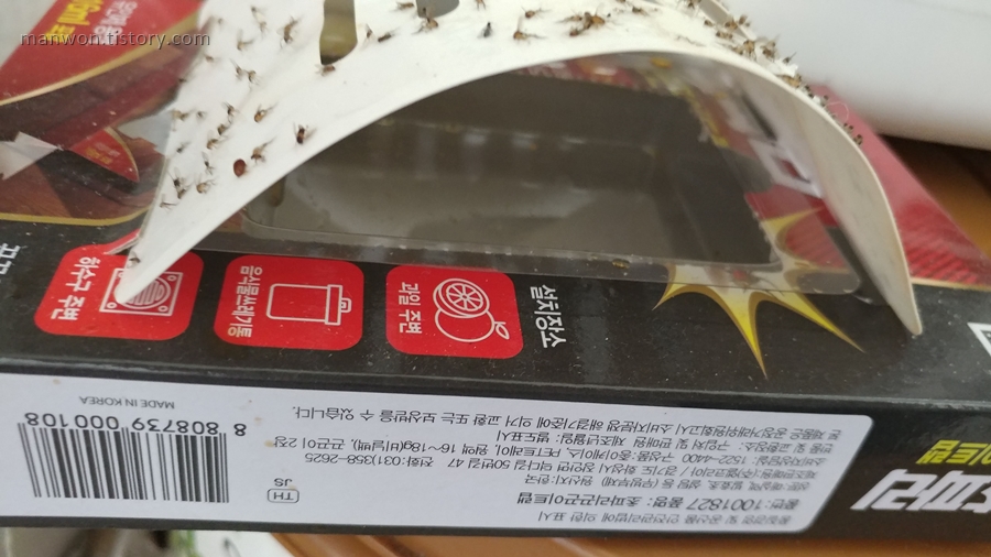 [알림] 위 사진은 7월 30일 설치한 사진이고 아래 사진 3장은 대략 한 달 후인 9월 1일 촬영한 사진입니다. 초파리가 엄청 많이 잡혀서 경우에 따라서 보기에 불편하실 수 있습니다. 참고하세요.