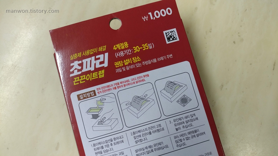 천 원으로 2회 사용할 수 있고 1회에 대략 30~35일 정도 쓸 수 있다고 하니 천 원짜리 1장으로 가장 초파리가 극성인 7월, 8월 이렇게 쓸 수 있는 셈이다. 참으로 저렴하다.