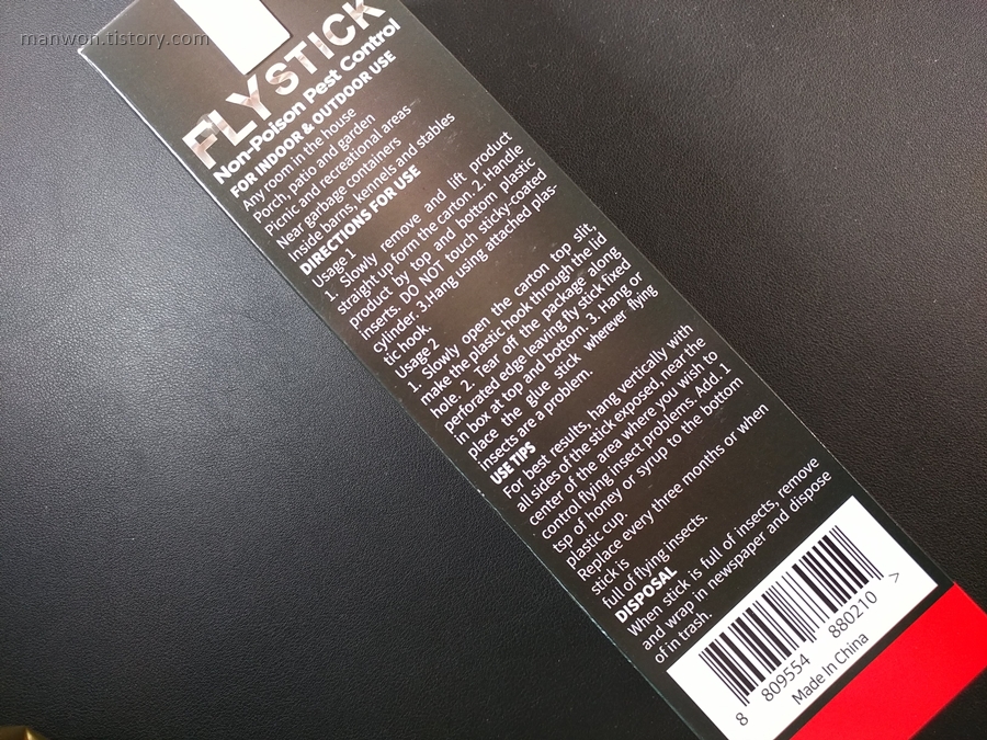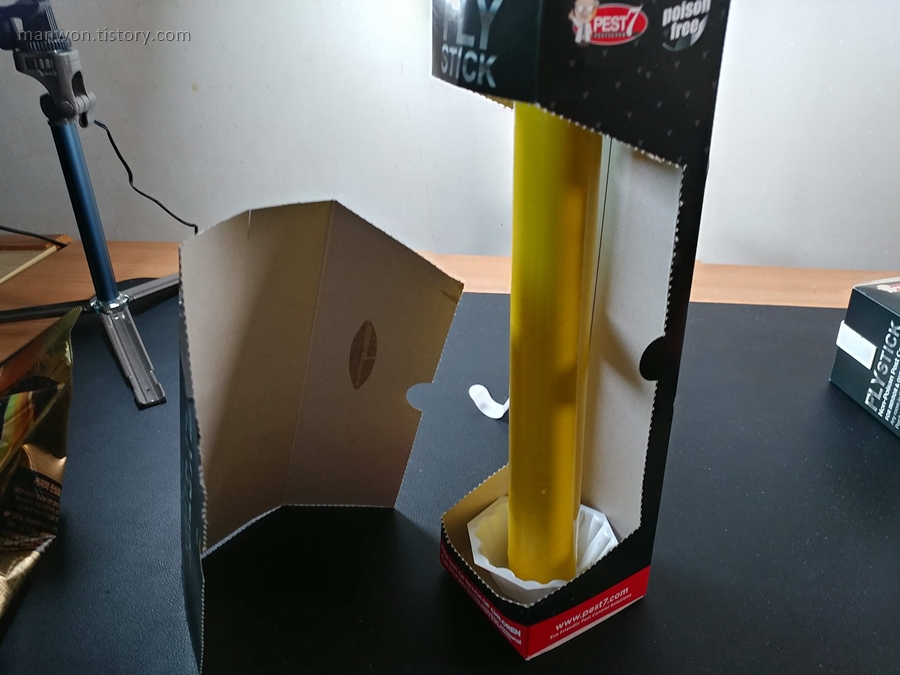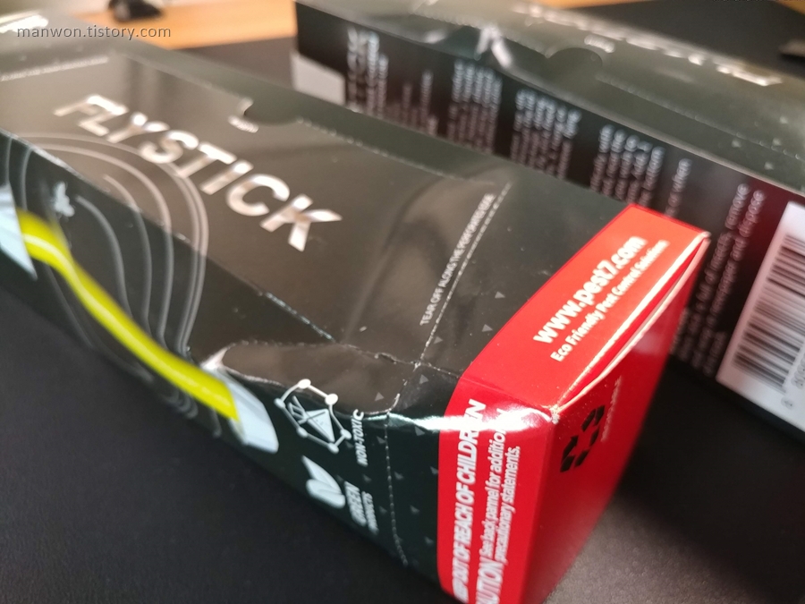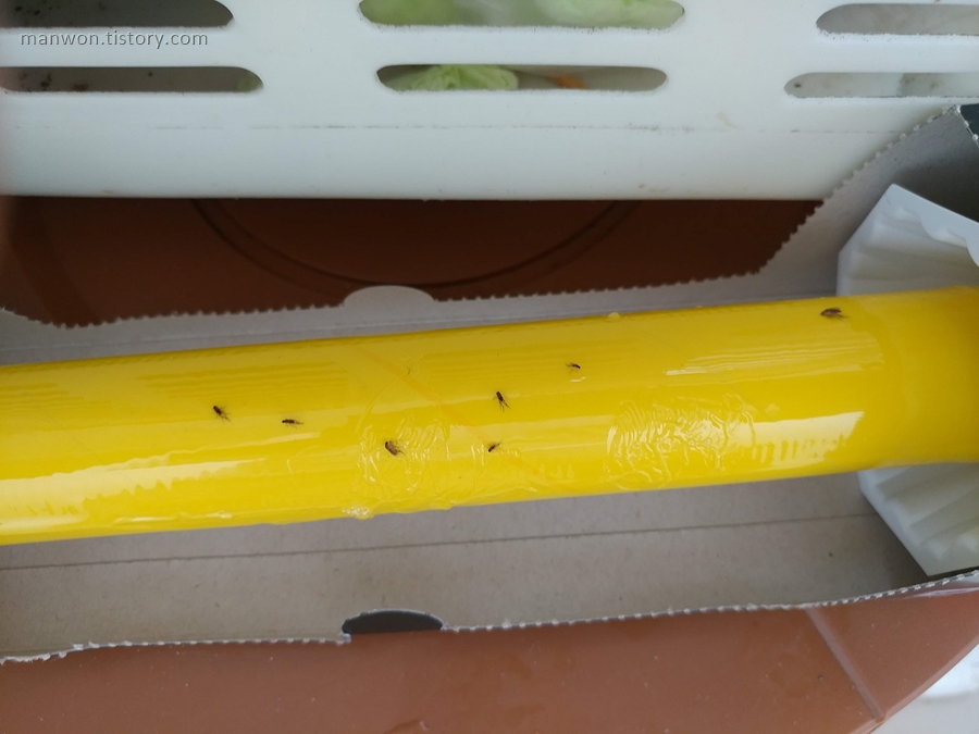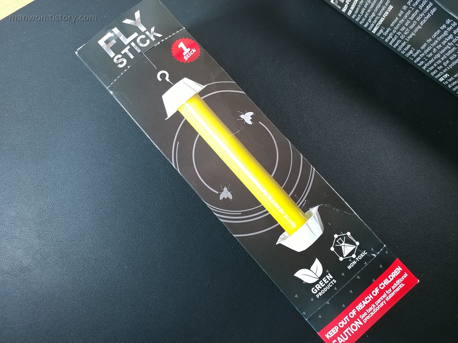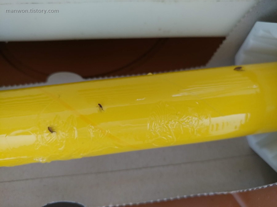 내가 이 제품을 구매한 이유는 유인액을 쓰지 않기 때문이다. 저 형광빛 노란색에 초파리가 반응을 해서 달라붙는 원리 같다. 유인액에 해당하는 어떠한 물질을 저 노란색 막대 표면에 미리 발라 놓았는지 여부는 나도 잘 모른다.
