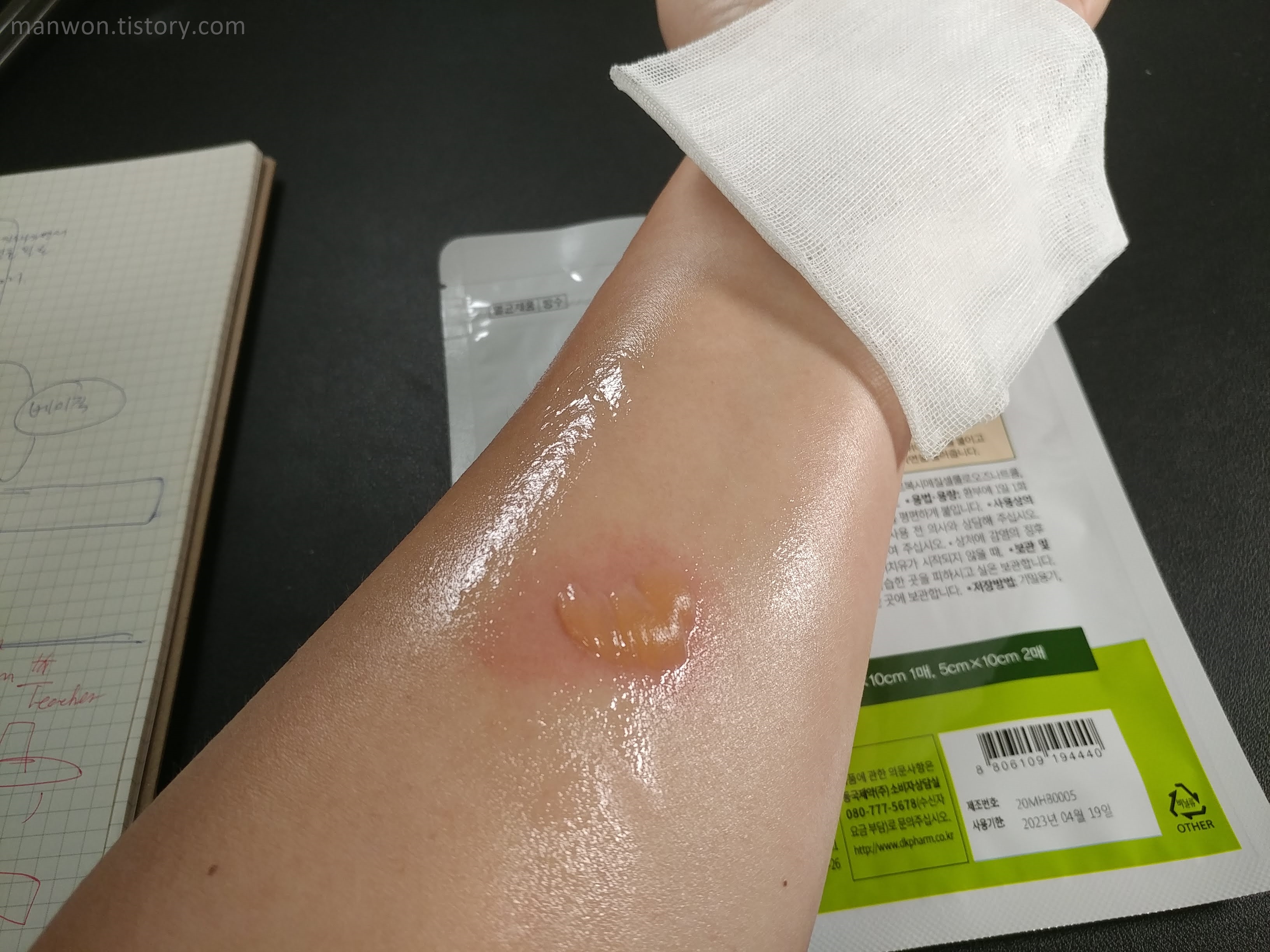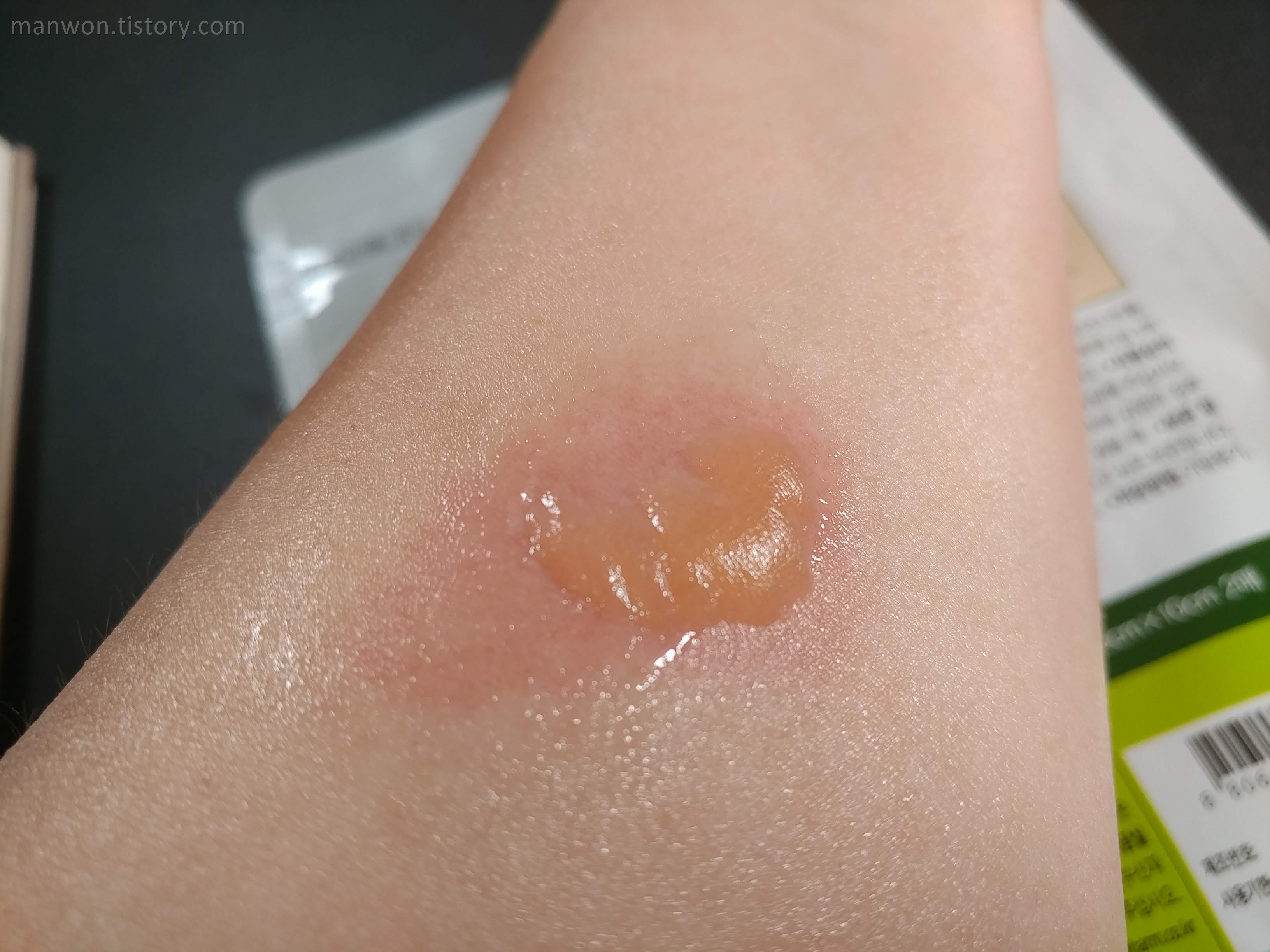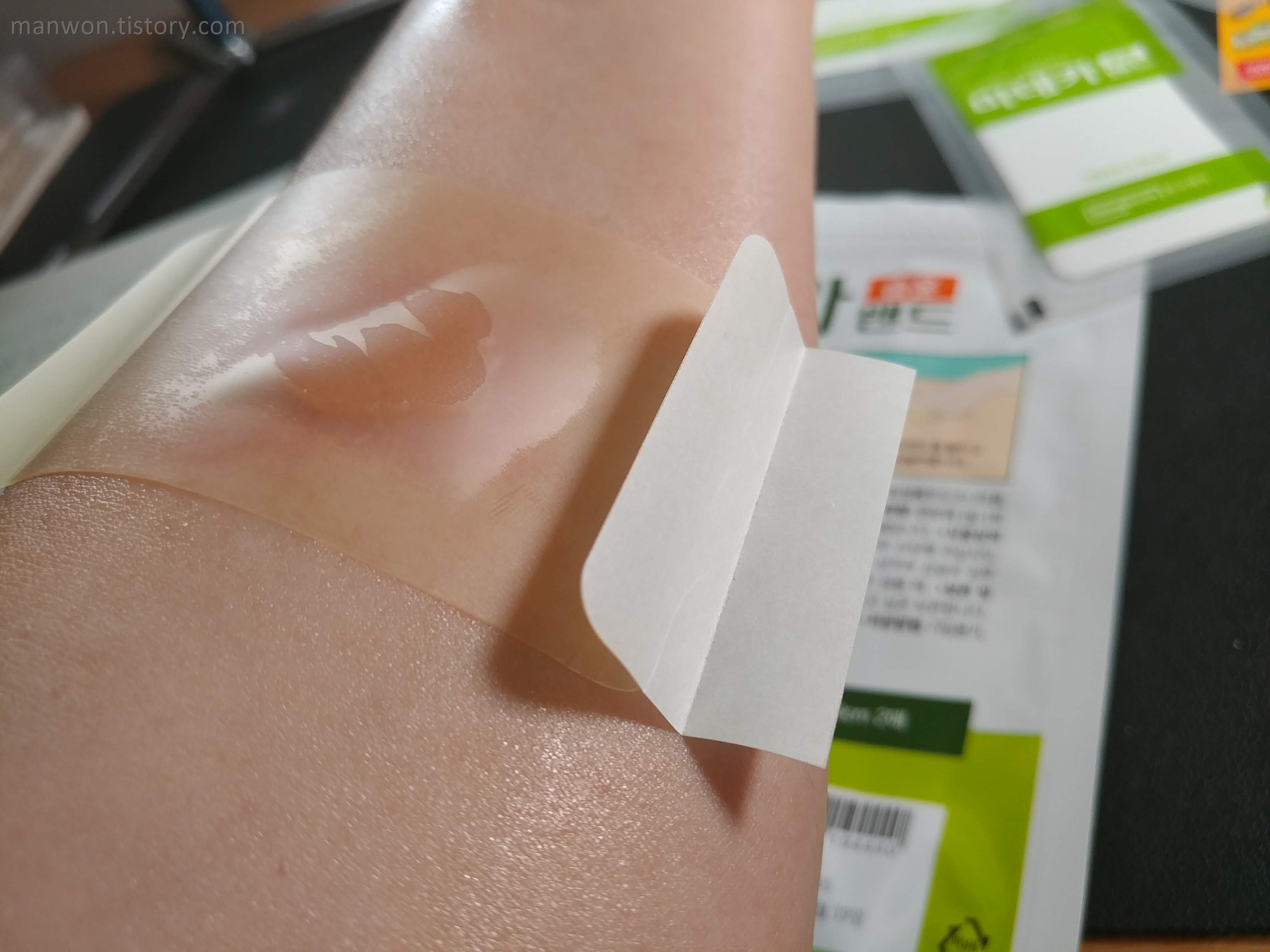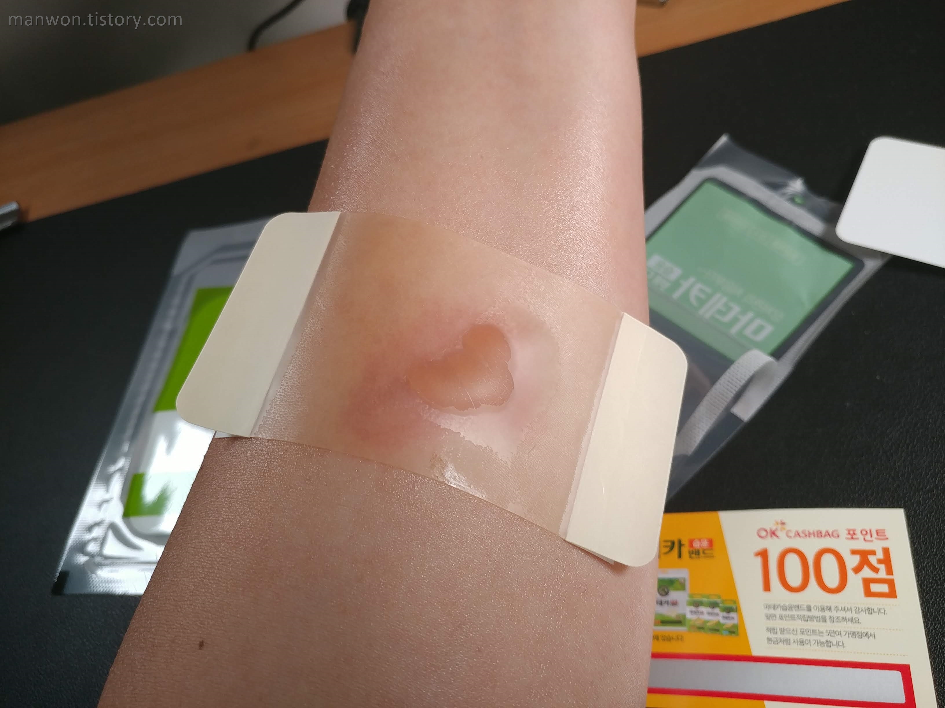 주의: 다음날 알게 된 건데, 참고로 이거 화상 입은 부위. 특히 물집이 난 부위는 절대 붙이면 안 된다. 이 마데카 습윤밴드는 화상용이 아닌 것 같다. 왜냐면 이 밴드가 물집에 붙을 경우 나중에 떼어낼 때 물집이 터지기 때문이다. 2도 화상의 경우 물집이 터지면 감염되기 쉽기 때문에 절대로 물집을 터뜨리면 안 된다. 우리 동네 약사는 왜 이걸 추천해줬는지 모르겠다. 내가 팔뚝에 물집까지 분명히 보여줬는데 말이다.