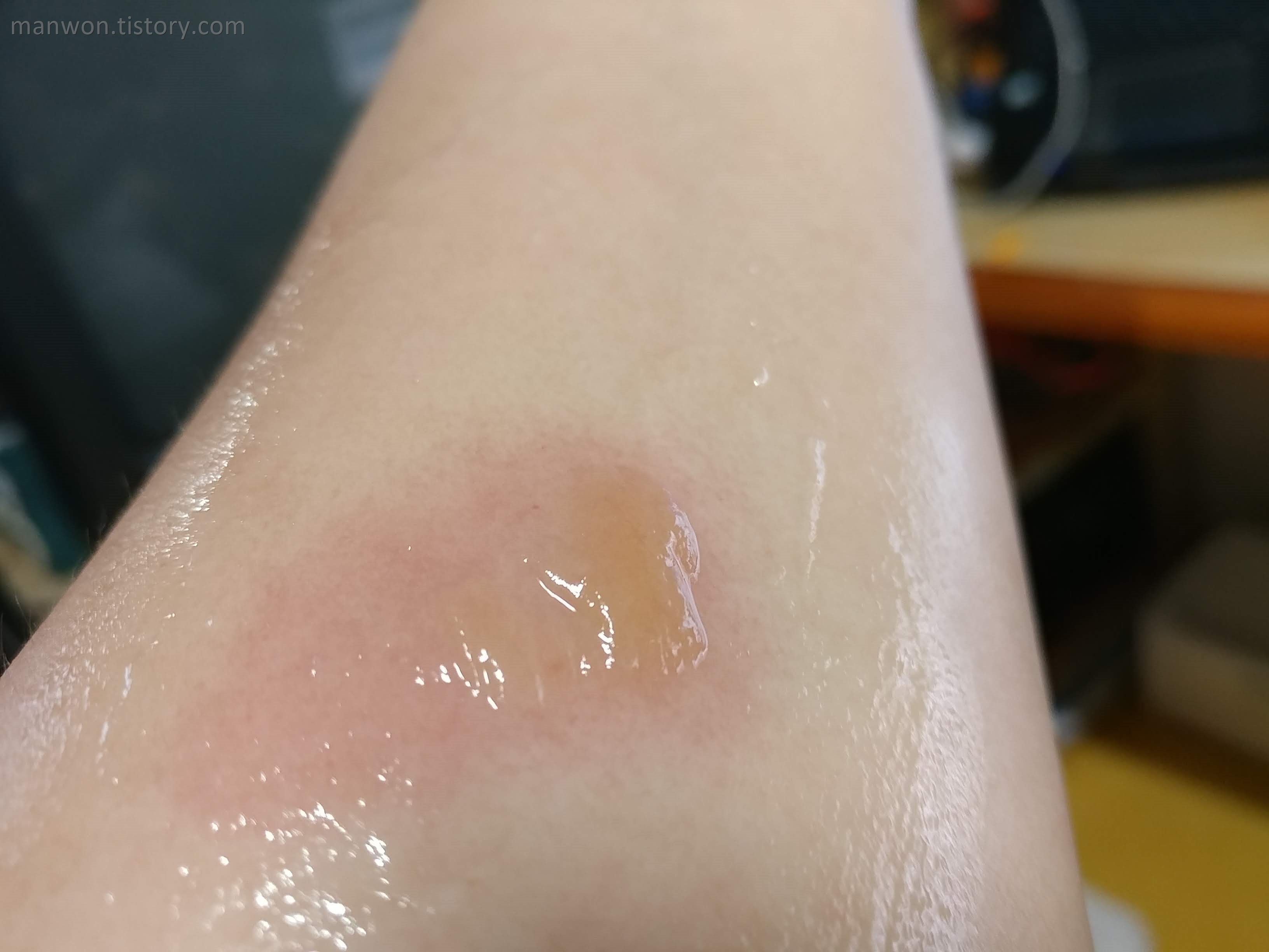커피를 끓이려다 커피포트 수증기에 화상을 입었다. 왼팔뚝의 안쪽 부위다. 처음에는 피부가 멀쩡했는데 1시간 후부터 살짝 붉어지는 듯하더니 기어코 물집이 생겼다. 물집도 처음에는 크지 않았는데 시간이 갈수록 부풀어 오르더라.