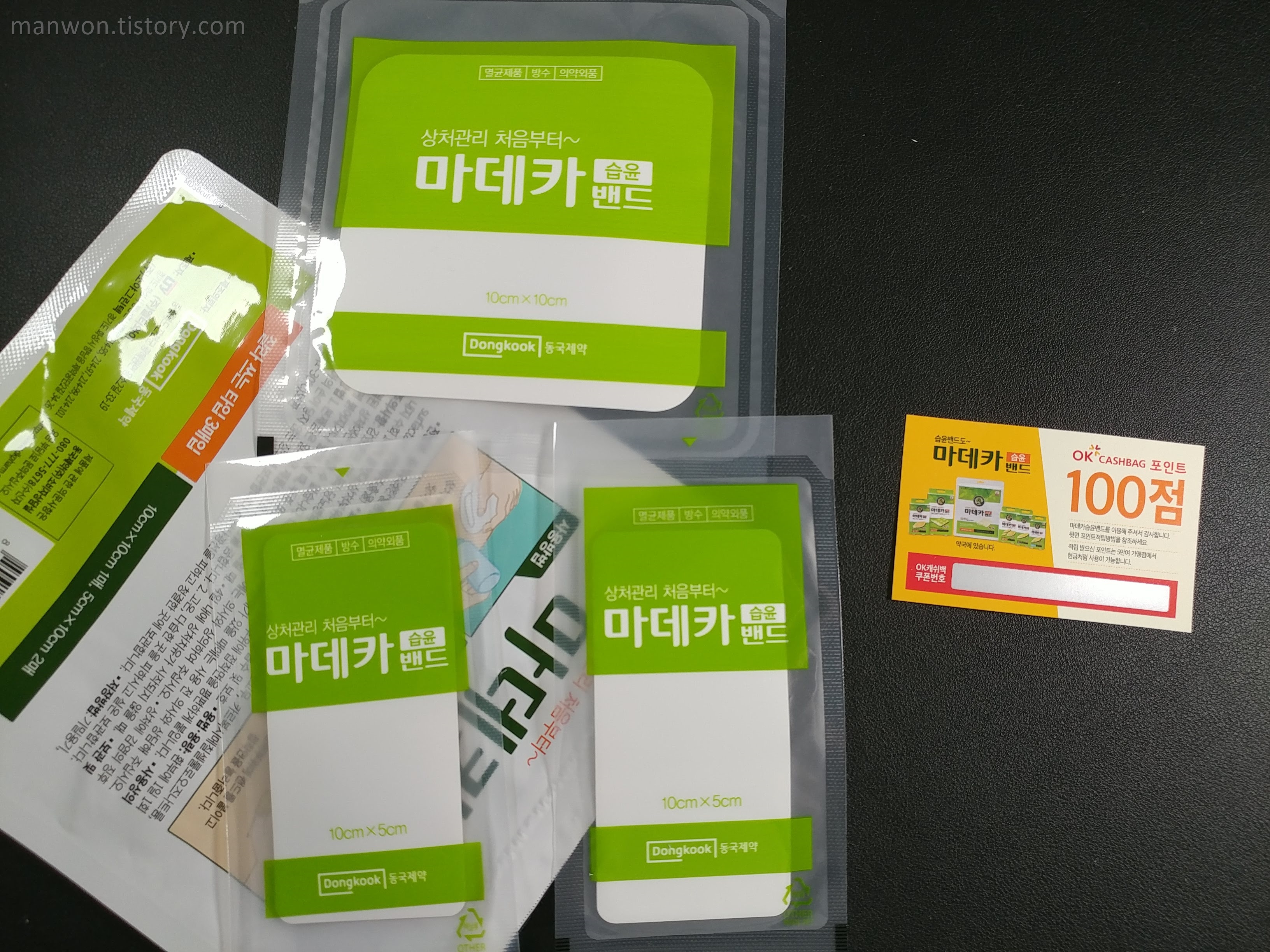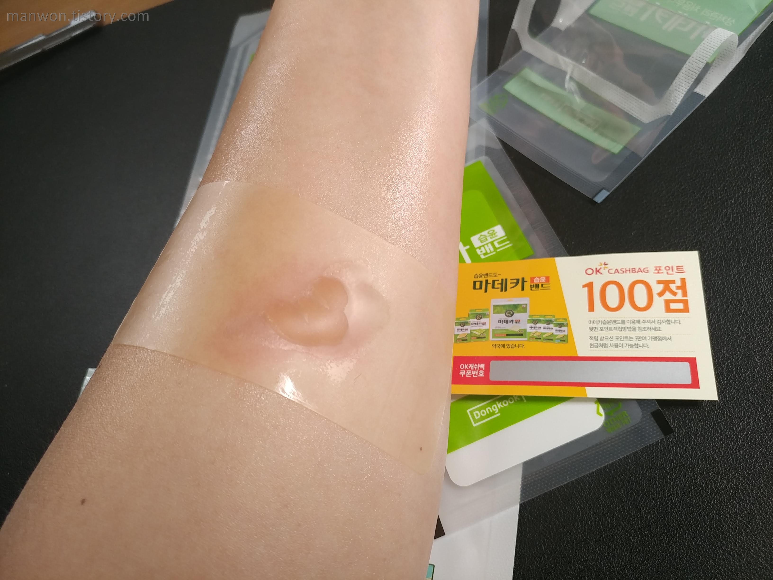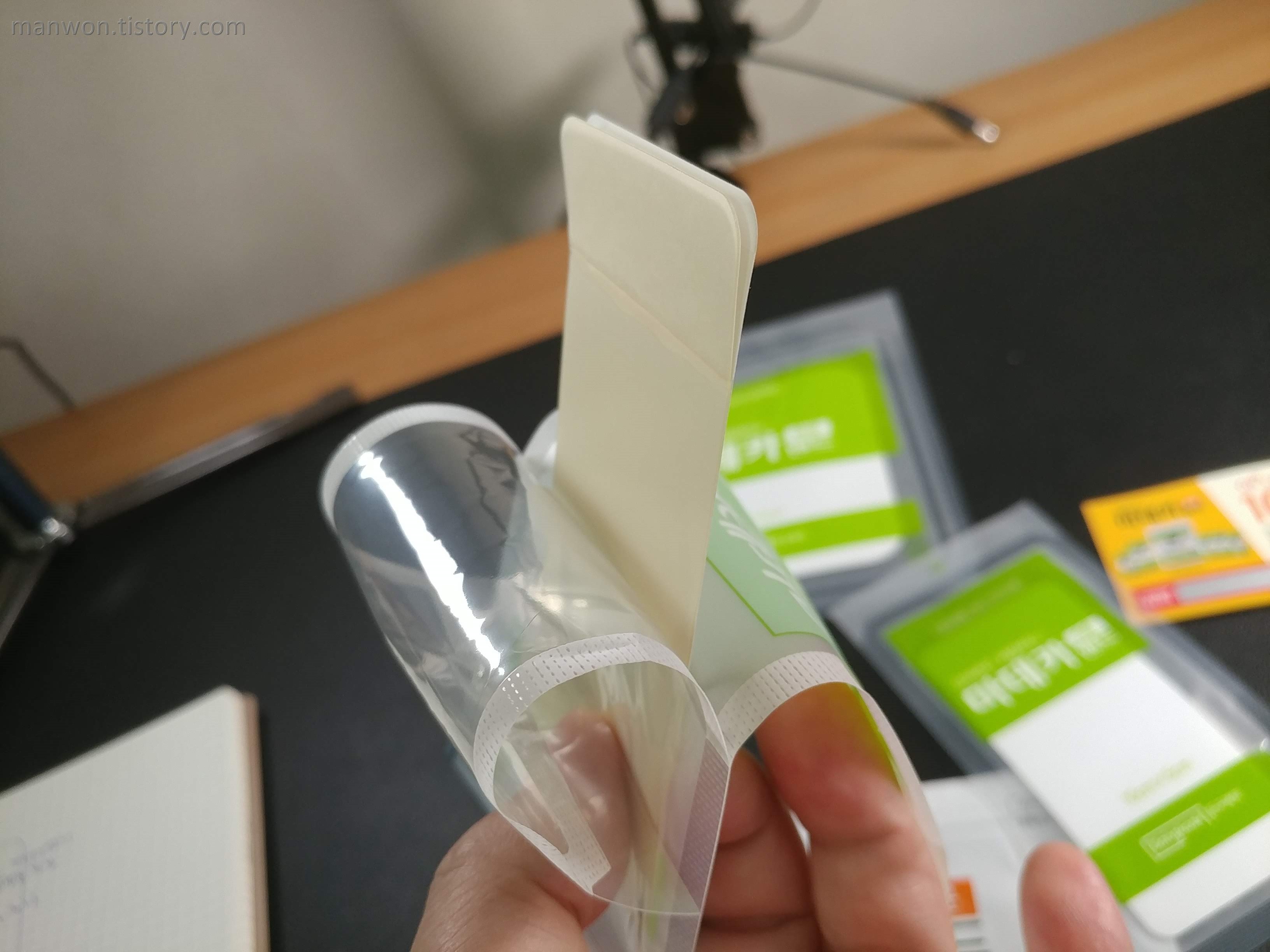 위 사진을 보면 밴드 가운데에 보호 패드가 있는 게 보인다. 아마도 그 보호 패드는 접착 성분이 없을 것이다. 내가 오늘 붙인 마데카 습윤밴드는 저 보호 패드가 없어서 다음날 물집 터지기 않게 떼느라고 아주 애 먹었다. 해당 내용은 다음 포스팅에 기록하겠다.