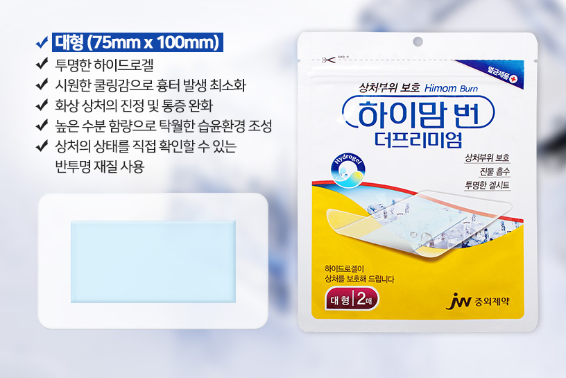 결과적으로 다시 한번 정리하면 화상에 밴드를 붙이고 싶다면 위 사진의 마데카 습윤밴드를 붙이면 안 된다. 아마도 해당 제품은 화상용이 아니라 물집이 생기지 않는 일반 상처용으로 나온 제품 같다. 굳이 밴드를 붙이고 싶으면 중외제약의 하이맘 번 더 프리미엄을 붙여야 할 것 같다. 해당 제품은 화상 전용으로 나온 밴드이고 투명한 접착면 가운데 접착 성분이 없는 보호패드가 붙여져 있는 것 같다. 아래 사진 참고.
