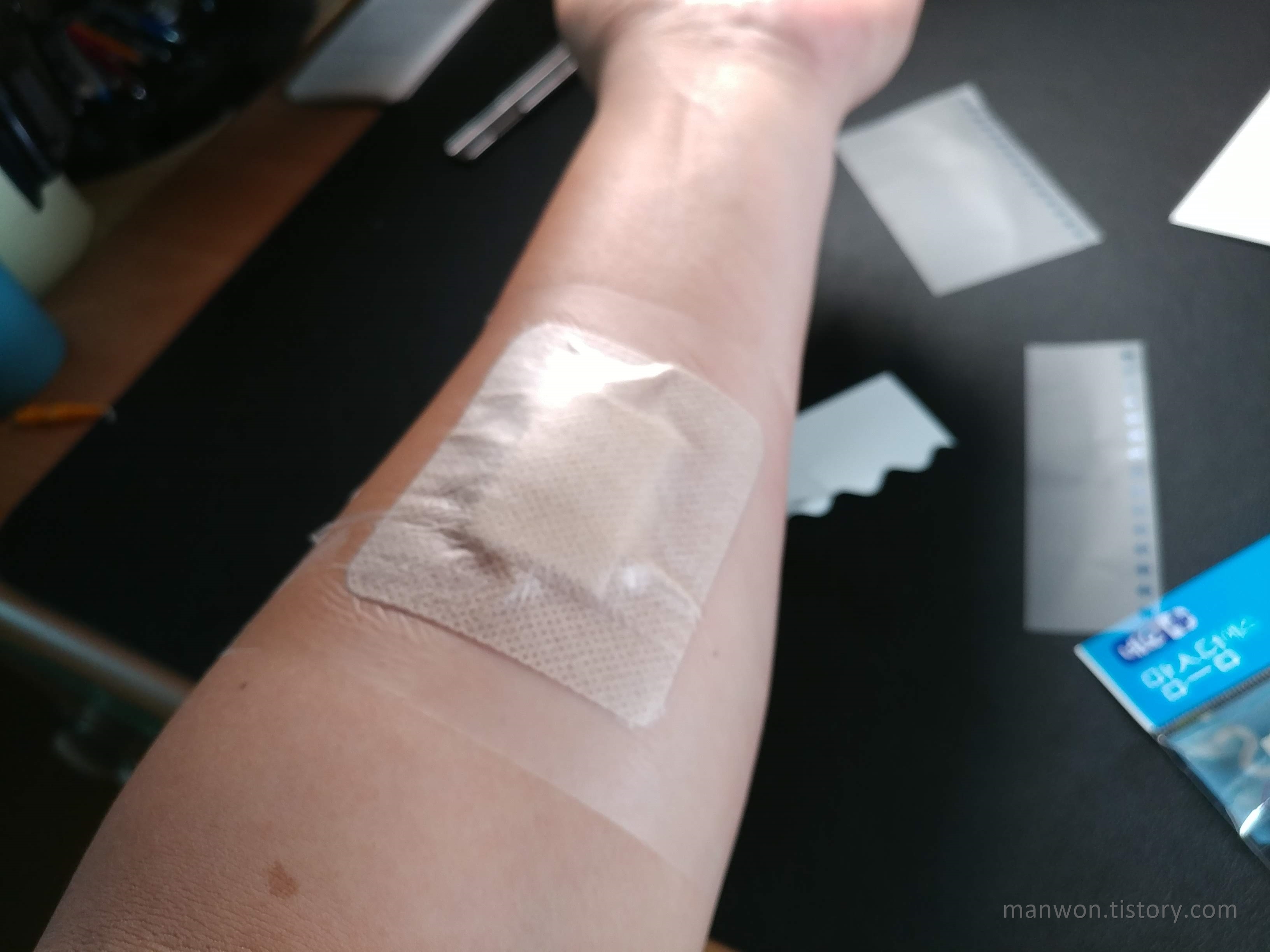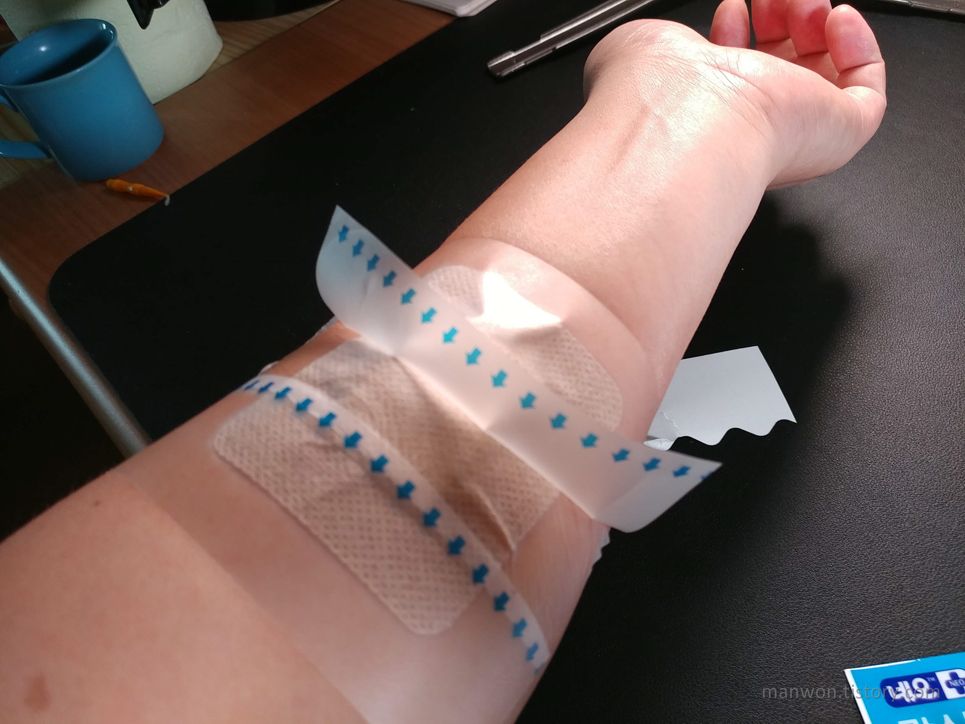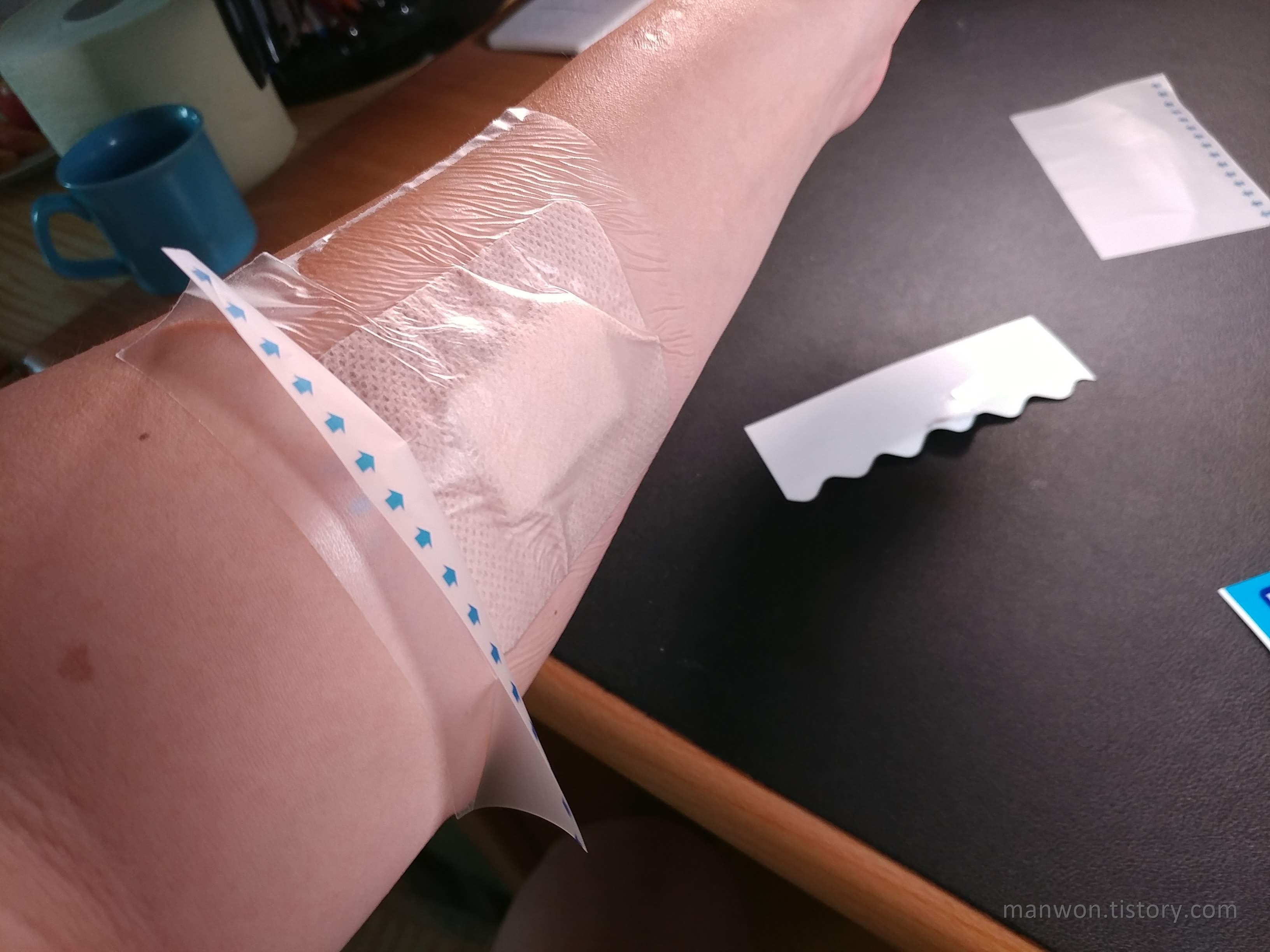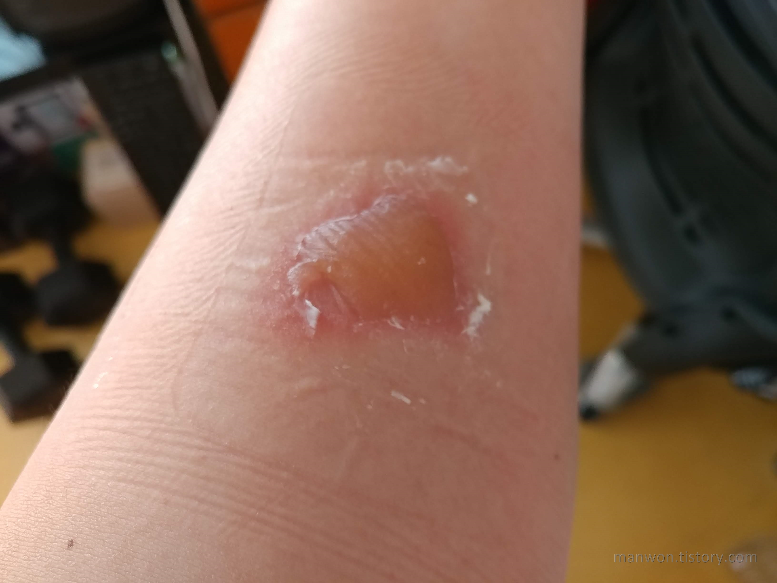 화상 입은 곳은 여전하다. 통증과 가려움증은 없는데 물집이 아직 그대로다. 물집 속 체액의 색깔이 조금 더 진해진 느낌도 든다. 오늘은 샤워를 하기 위해서 투명 방수밴드를 붙여 봤다. 이게 처음 해보는 거라 붙이는 방법이 조금 생소했다. 알고 보니 간단한데 '방수밴드 붙이는 방법'을 검색하는 분들도 있을 것 같아서 아래에 간략히 설명해 보겠다.