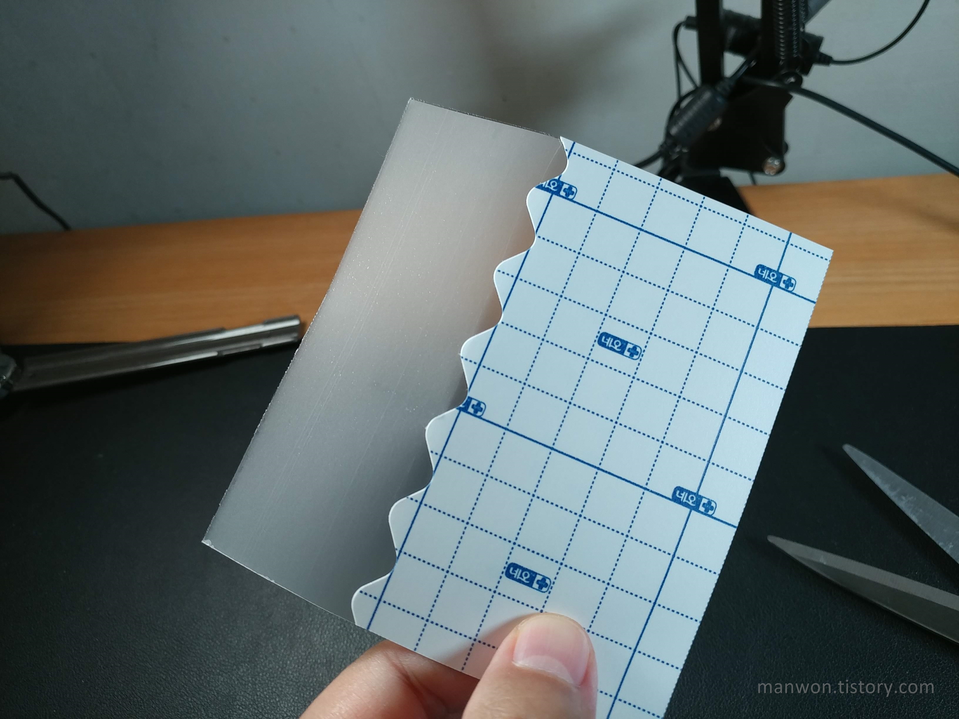 위 사진에서 서로 다른 방향을 가리키는 화살표가 보일 것이다. 그 화살표 방향으로 맨 겉면의 필름을 벗기면 된다.