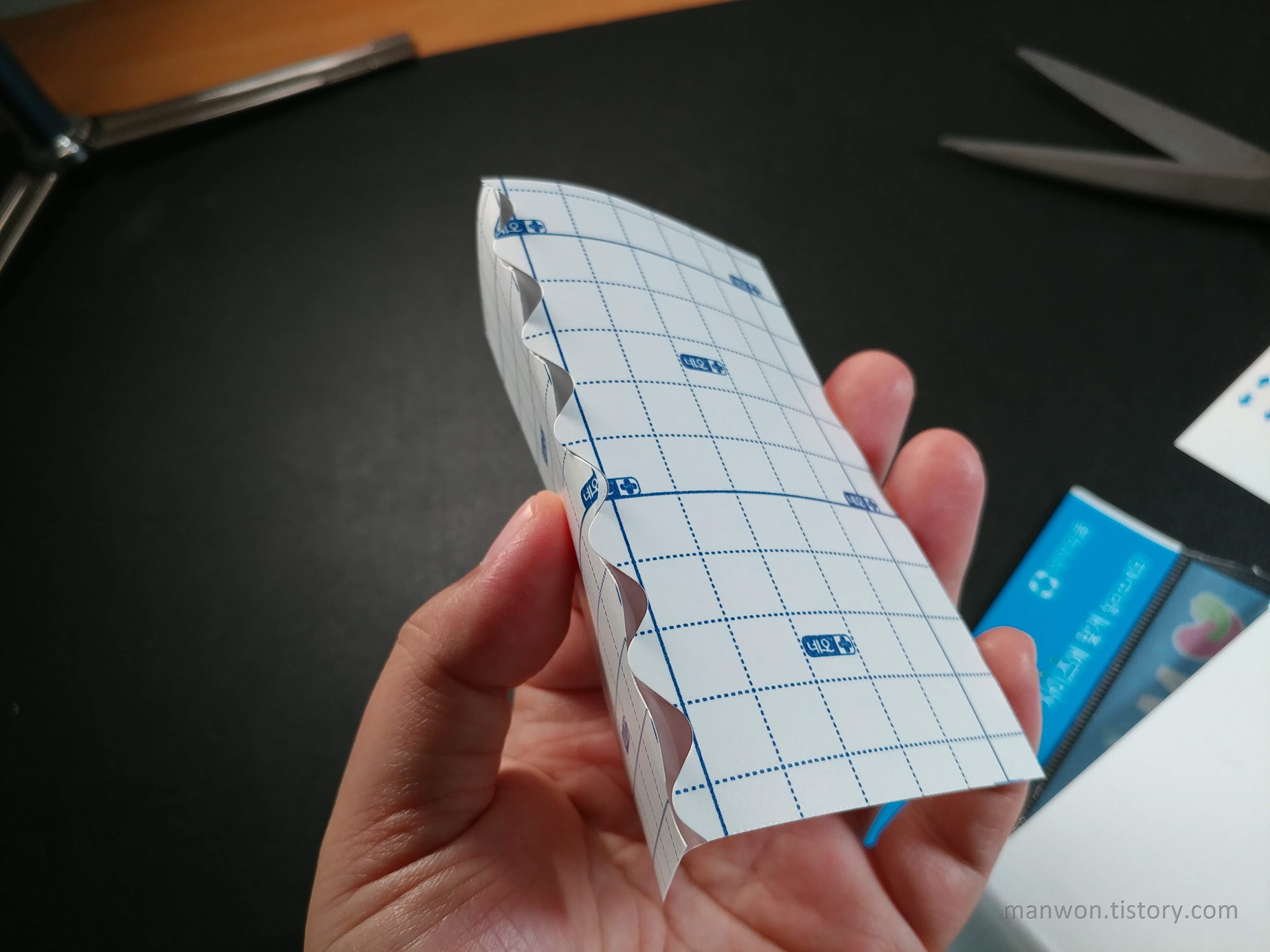 이런 모습이 된다. 위 사진에서 벗겨진 왼쪽 부분을 환부에 덴 후 오른쪽 격자무늬 종이를 벗기면서 붙인다.
