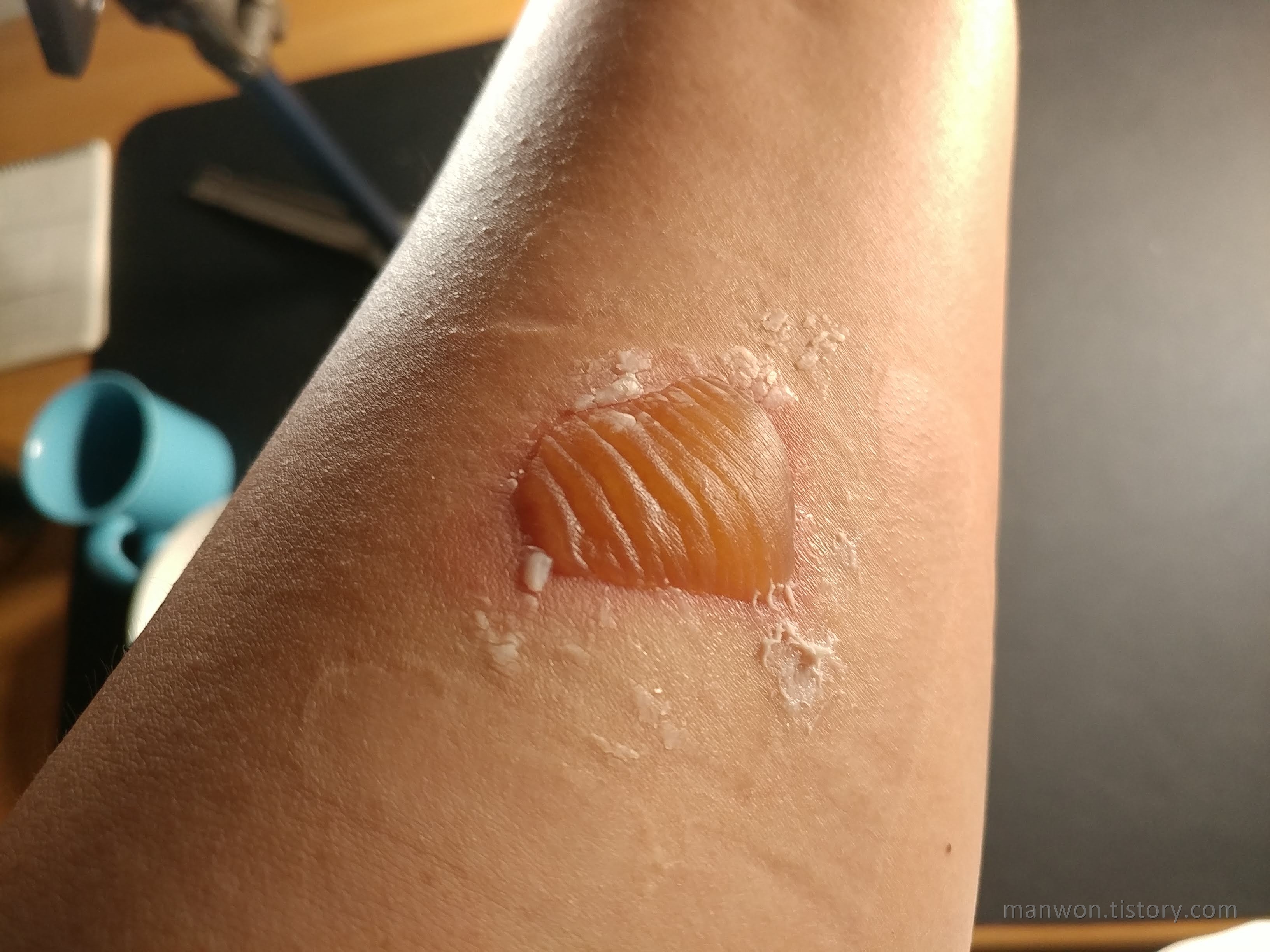 사실 커피포트의 뜨거운 김에 덴 적이 한두 번이 아닌데, 왜 이번만 이렇게 심하게 화상을 입었는지 모르겠다. 아마도 이번에는 커피포트 주둥이 바로 위에서 피부가 뜨거운 김에 접촉됐고, 가장 높은 온도라 커피포트가 딸깍~ 하고 꺼지는 순간에 화상을 입은 거라 이렇게 된 것 같기도 하다.
