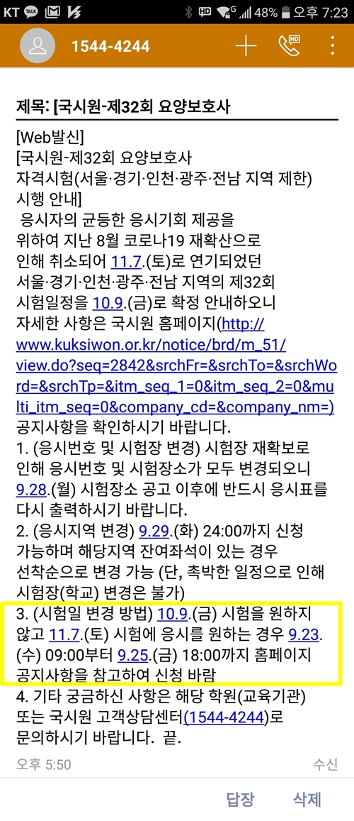 뭐야! 시험일이 또 변경이 된 거야? 하긴 내 입장에서는 11월 7일에 보는 것보다 10월 9일로 앞당겨 보는 게 더 나을 수도 있겠다는 생각도 들었다. 그리고 잠시 후 국시원에서도 아래와 같은 문자 메시지가 왔다.