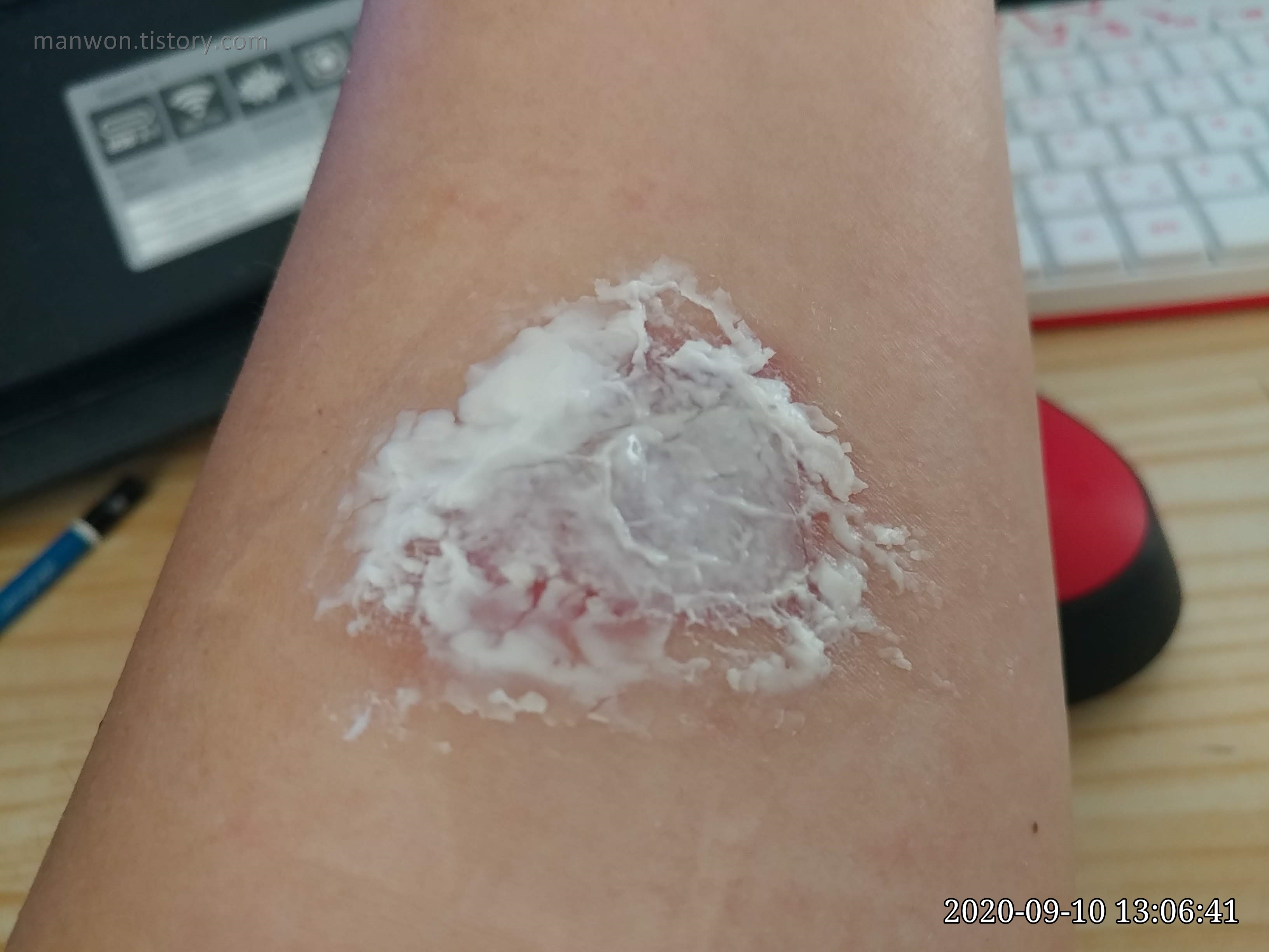 비아핀 화상연고는 바르는 방법이 좀 특이한데, 먼저 바른 곳이 시간이 경과해서 어느 정도 마르면 그 위에 다시 두텁게 덧바르는 방법이다. 설명서를 보면 2도 화상의 경우 약 0.5cm 두께로 바르라고 나와 있는데 그렇게 바르면 1만 원짜리 연고가 줄어드는 게 팍팍 느껴질 정도다. 위 사진처럼 덧바른 후 드레싱 밴드로 덮어주는 게 지금 내가 하는 있는 치료의 전부다. 샤워할 때는 그 위에 방수밴드를 부착한다.