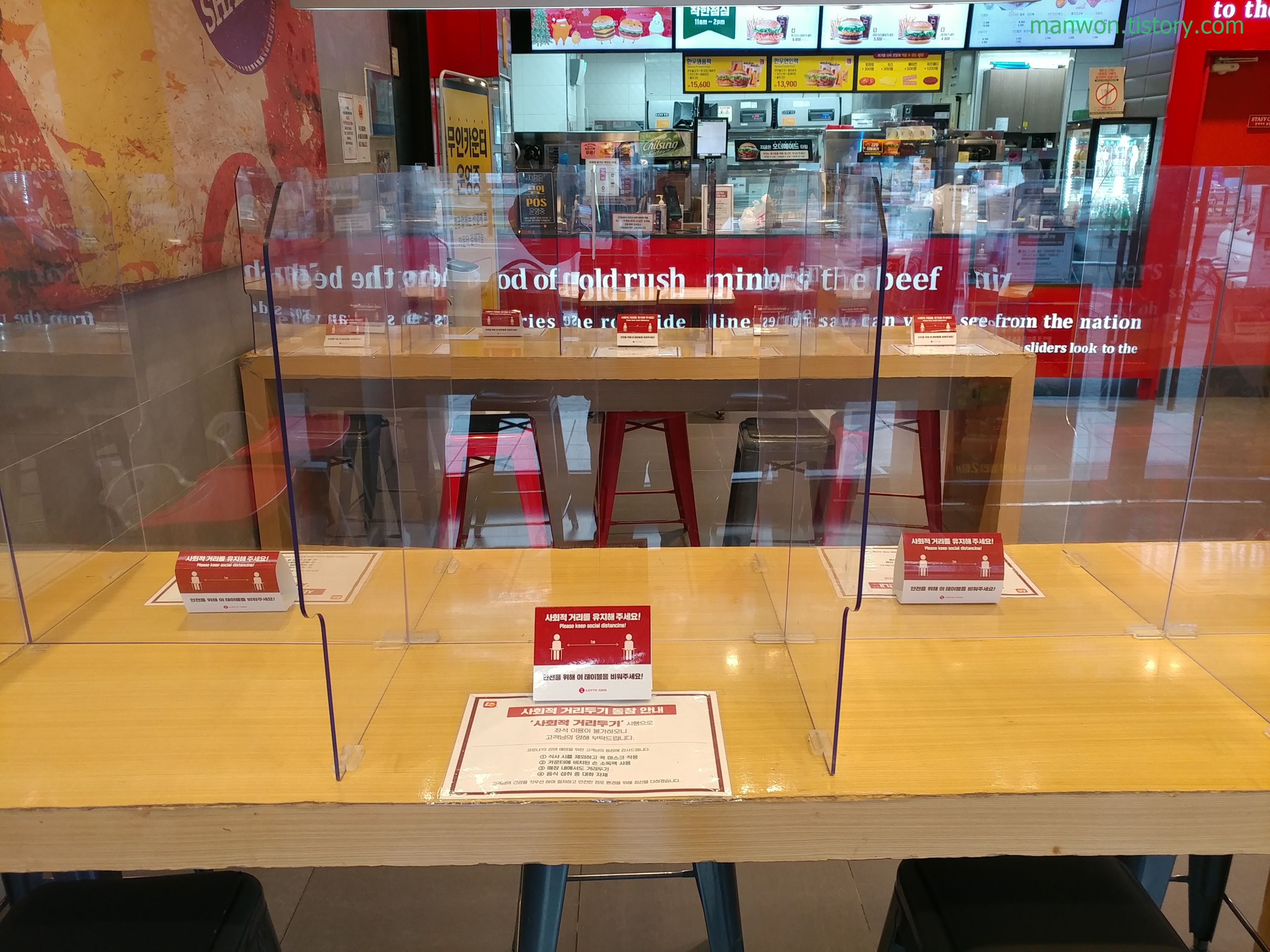 동네 롯데리아 매장에 도착했다. 코로나19 여파로 테이블에 이런 칸막이가 설치돼 있더라. 키오스크로 롯데리아 사각 새우버거 3개를 주문했다. 500원 추가해서 브리오쉬 번으로 변경했기에 5,000원 x 3 = 15,000원 결제!