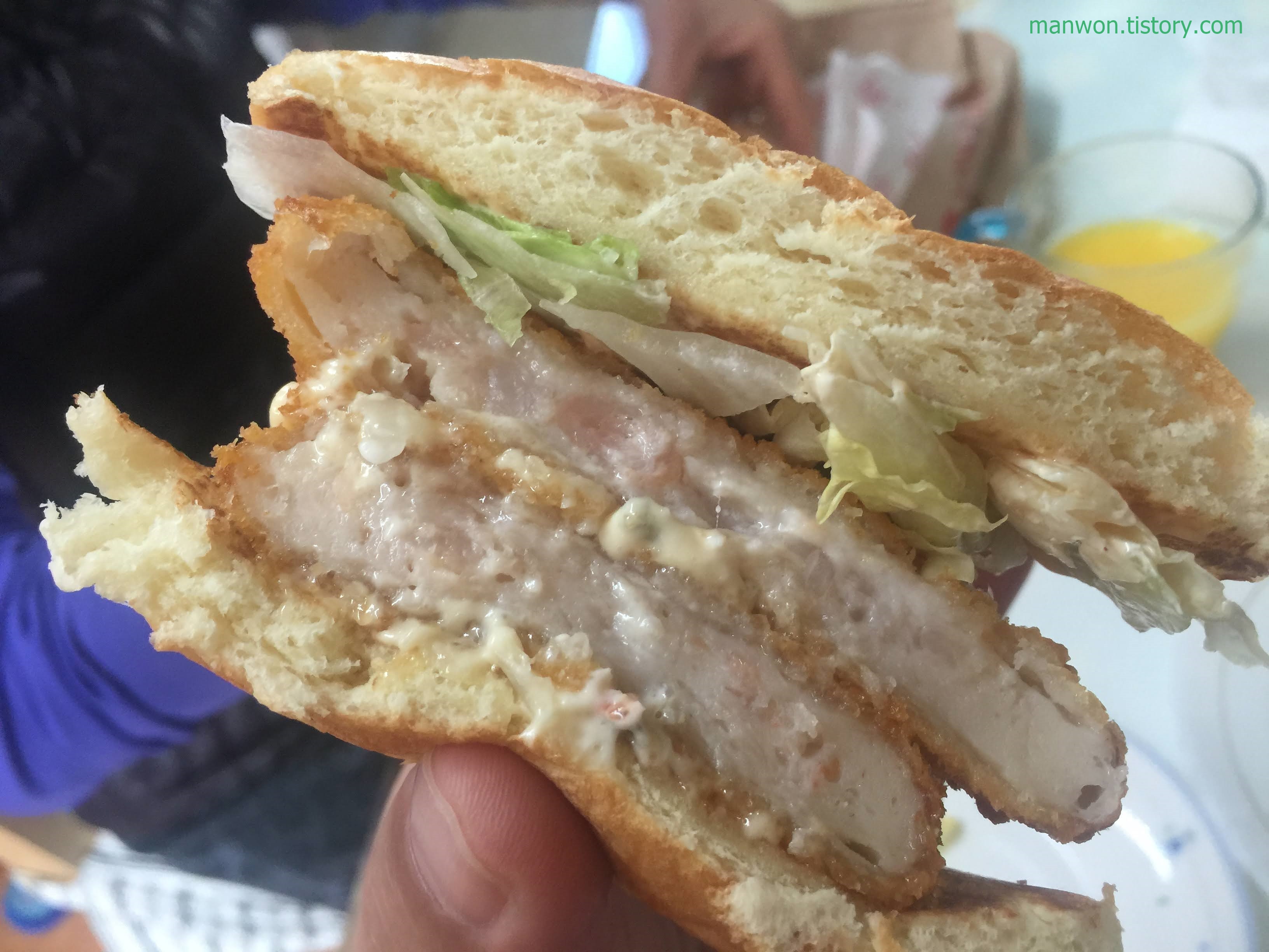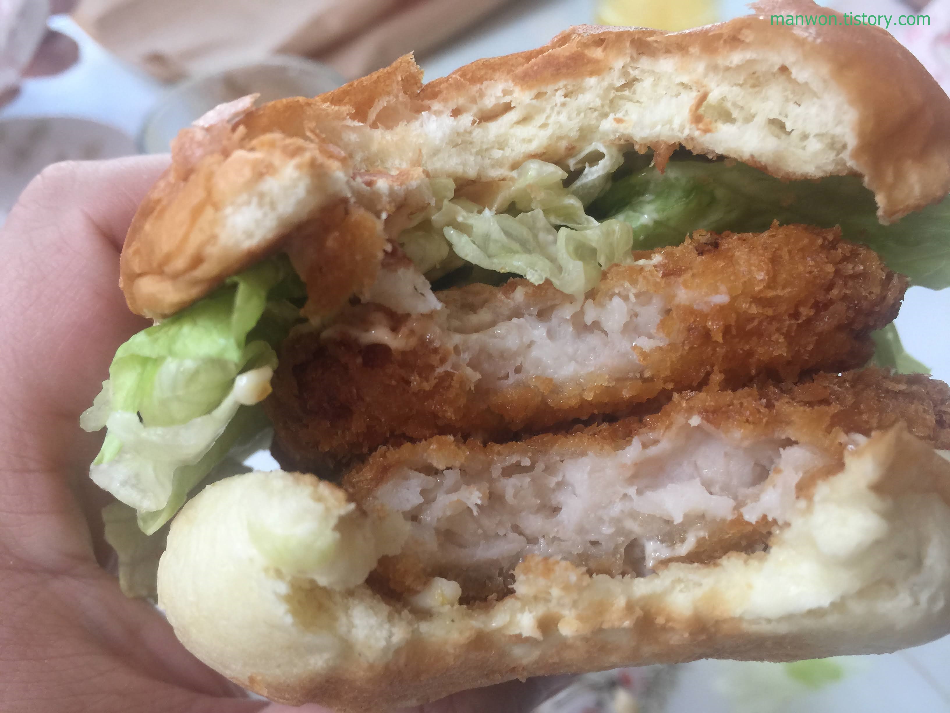 그런데 새우 패티 색이 예전보다 조금 진하다. 일반 새우 버거를 먹을 때는 패티 색이 저것보다 더 밝았는데 말이다. 그리고 패티와 패티 사이에 소스가 거의 없다. 슬슬 걱정이 밀려온다.