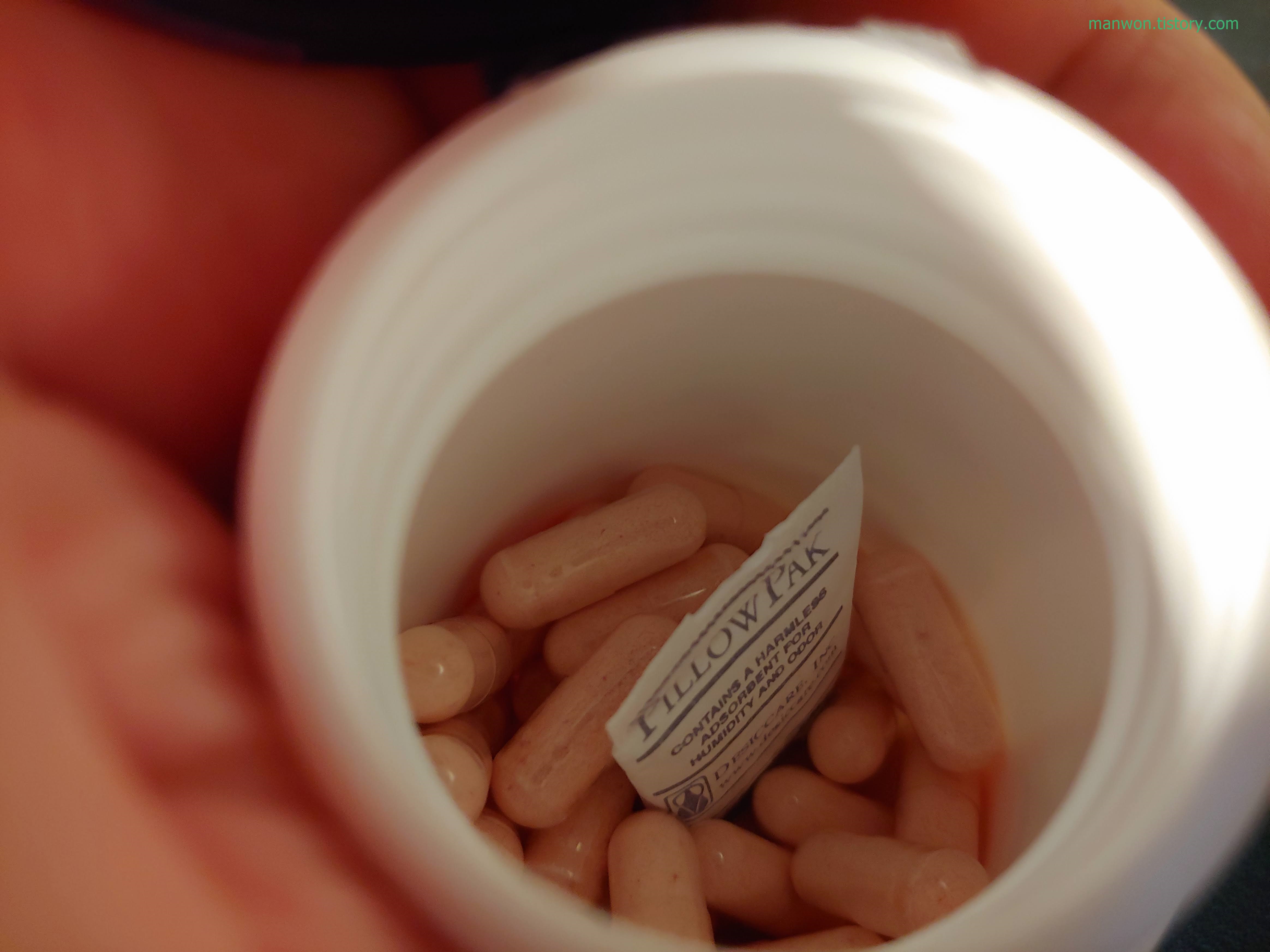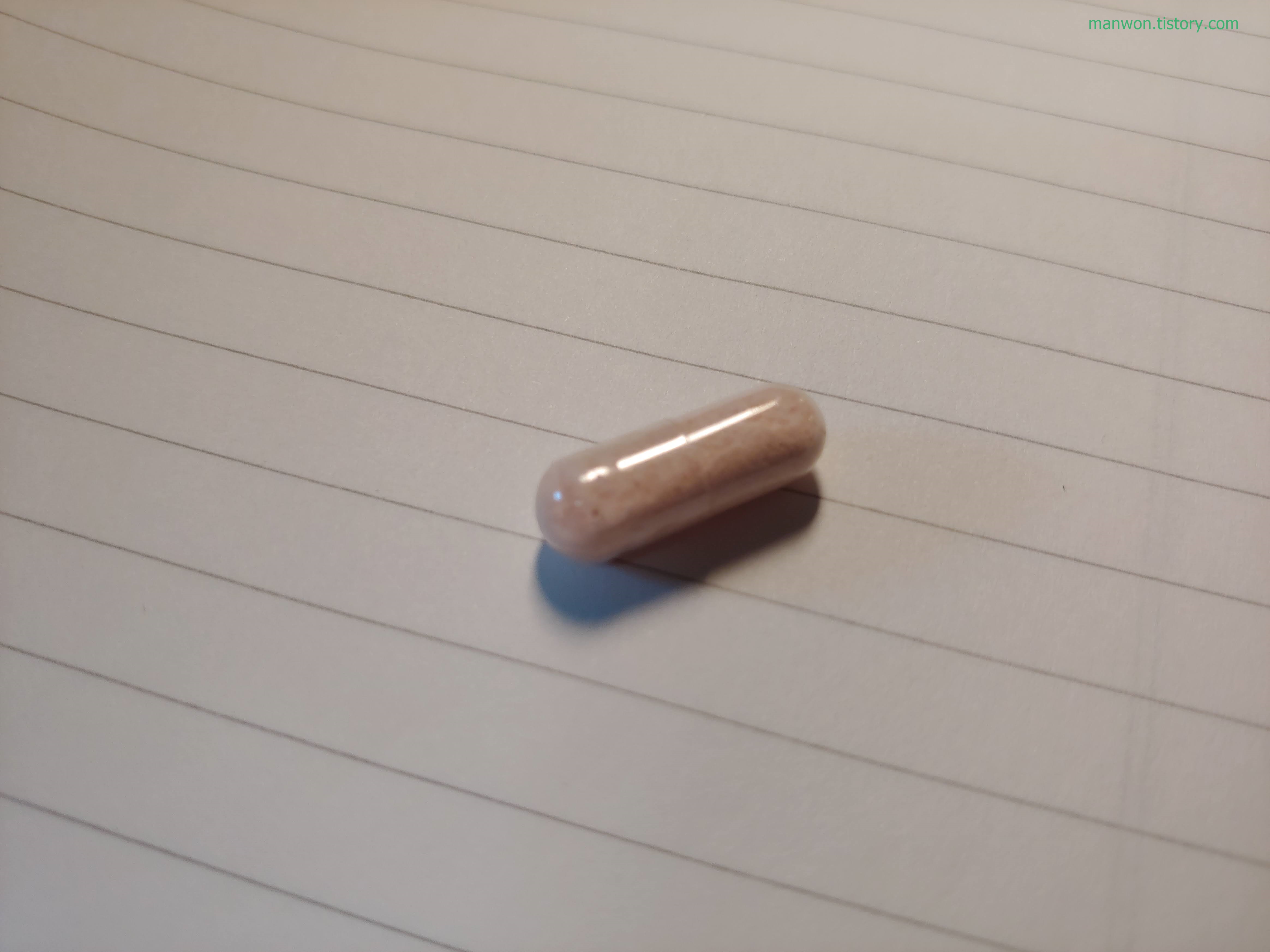 투명한 캡슐이라 안의 내용물이 보인다. 캡슐 크기는 길이로 대략 1.5cm 정도 되는 것 같다. 삼키는 데 거의 지장이 없는 수준.