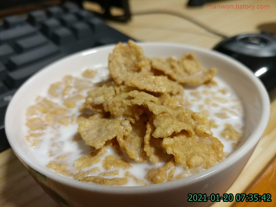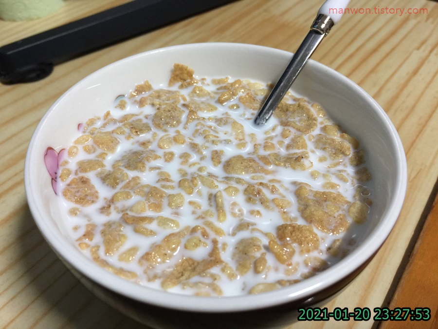 밤 11시 27분입니다. 밀가루가 들어간 야식, 이를 테면 치킨이라든지 하다 못해 스낵이라도 좀 먹고 싶은 마음이 간절해지는 시간입니다. 바로 이럴 때 바삭바삭한 '고소한 현피 포스트'를 우유에 말아먹을 때죠. 근데 이게 하나도 달지가 않아요. 그래서 단거 좋아하시는 분들은 좀 실망할 수도 있을 겁니다. 비록 달지 않아도 바삭바삭하고 고소해서 우유랑 함께 먹으면 과자 먹고 싶거나 밀가루 튀김 같은 거 댕길 때 꽤 도움이 됩니다.