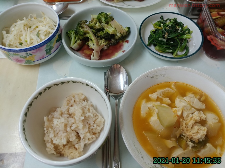 점심입니다. 밥과 순두부찌개에 브로콜리, 시금치, 무나물 등으로 소박하게 먹었네요.