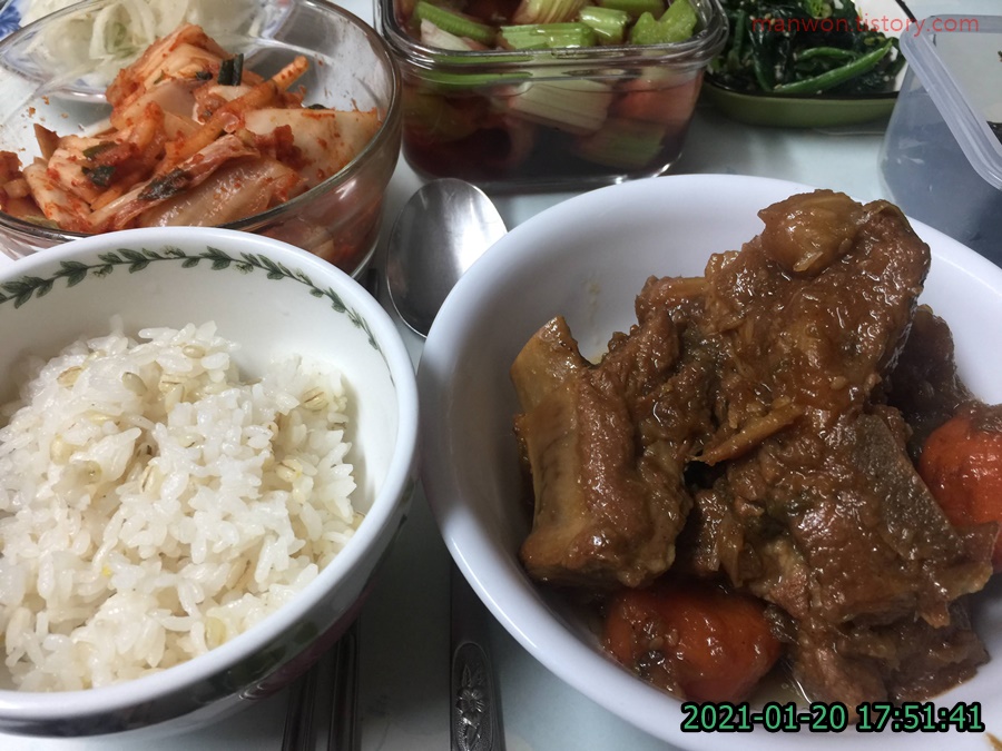 저녁에는 갈비찜을 먹었습니다. 밀가루 음식을 끊으면 저는 고기류가 많이 당기더라고요. 밀가루 음식을 못 먹어서 맛있는 음식 대부분을 포기해야 하니 그 반대급부로 맛있는 고기가 먹고 싶어지는 것 같습니다.