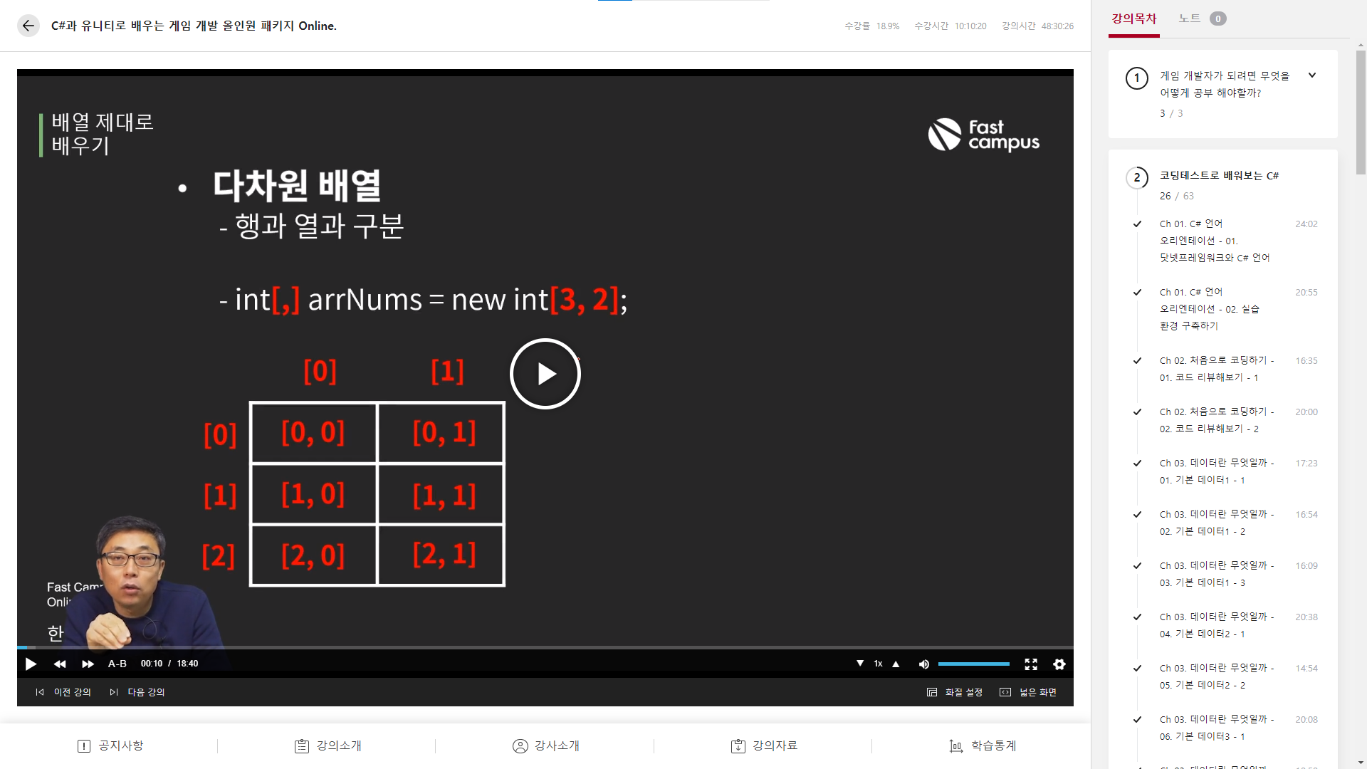 오히려 수강 후기를 솔직하게 말할 수 있을 것 같습니다. 지금 듣는 강의는 패스트캠퍼스의 'C#과 유니티로 배우는 게임 개발 올인원 패키지' Online 과정입니다. 이 과정은 전체 160강 정도 분량이고 챕터에 따라서 총 3분의 강사님이 강의를 하고 있습니다. 저는 현재 29강까지 밖에 진도를 나가지 못했고 첫 번째 강사님의 강의만 듣고 있는 상태입니다. 따라서 오늘 제가 기록하는 후기는 패스트캠퍼스 사이트와 첫 번째 강사님에 국한될 것입니다.