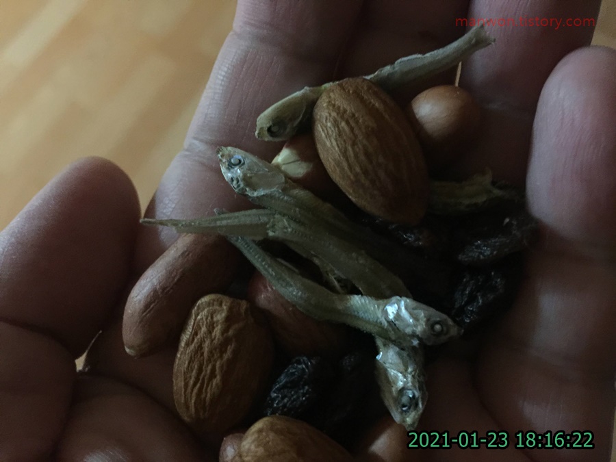 식후에 배는 부른데 입이 심심할 때가 있죠. 그럴 때는 이렇게 아몬드와 멸치, 건포도 등을 먹습니다.