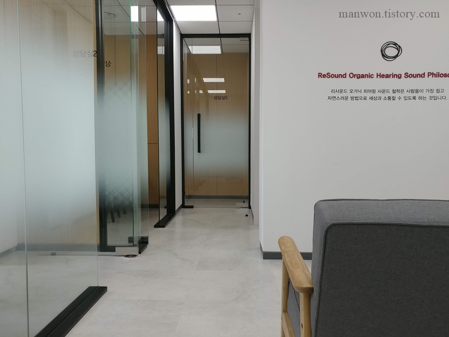 리사운드 보청기 본사 내부 모습이다. 사진 오른편으로 프런트가 있고 대기 고객이 7~8명 있었다. 보청기 착용자가 오면 사진 왼편에 보이는 개별 상담실 안에서 상담과 AS가 진행되는 것 같다.