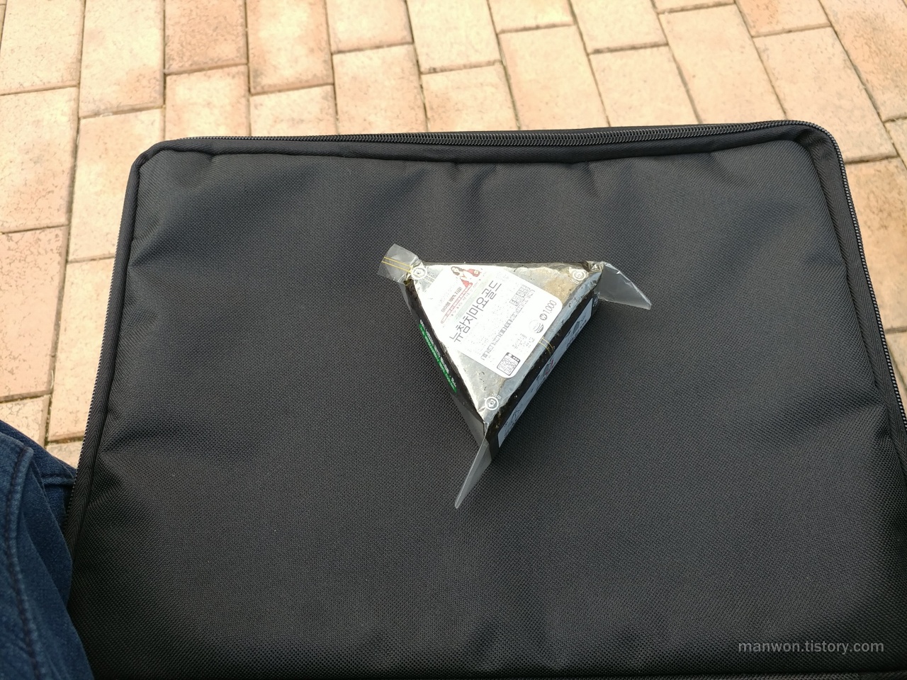 아까 편의점에서 산 삼각김밥을 먹는다.