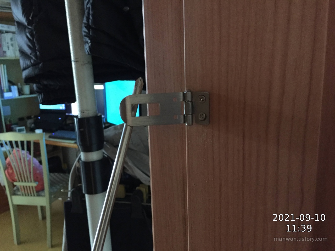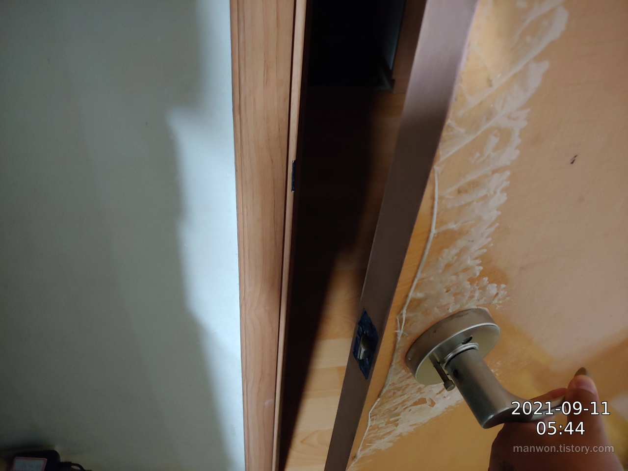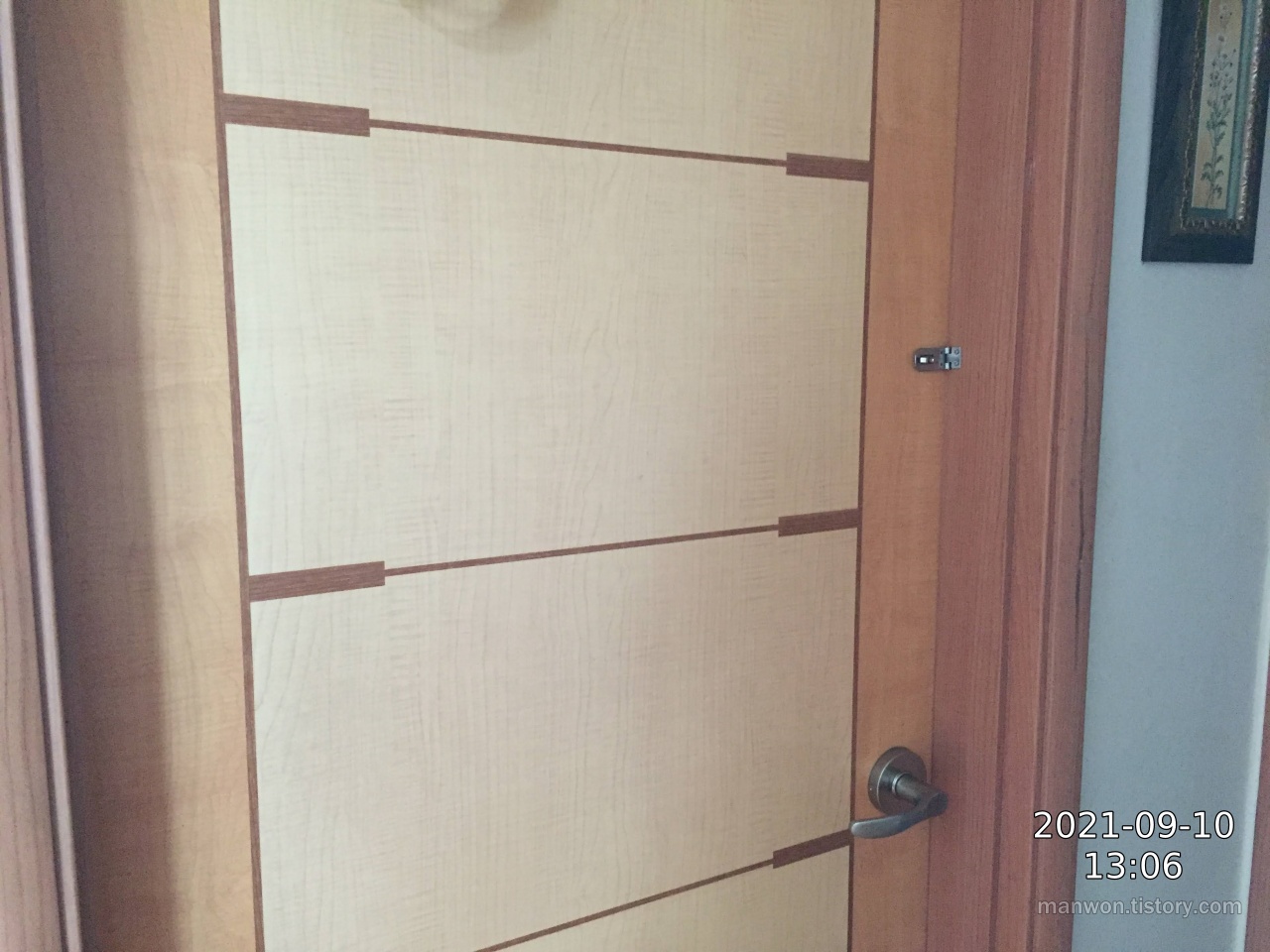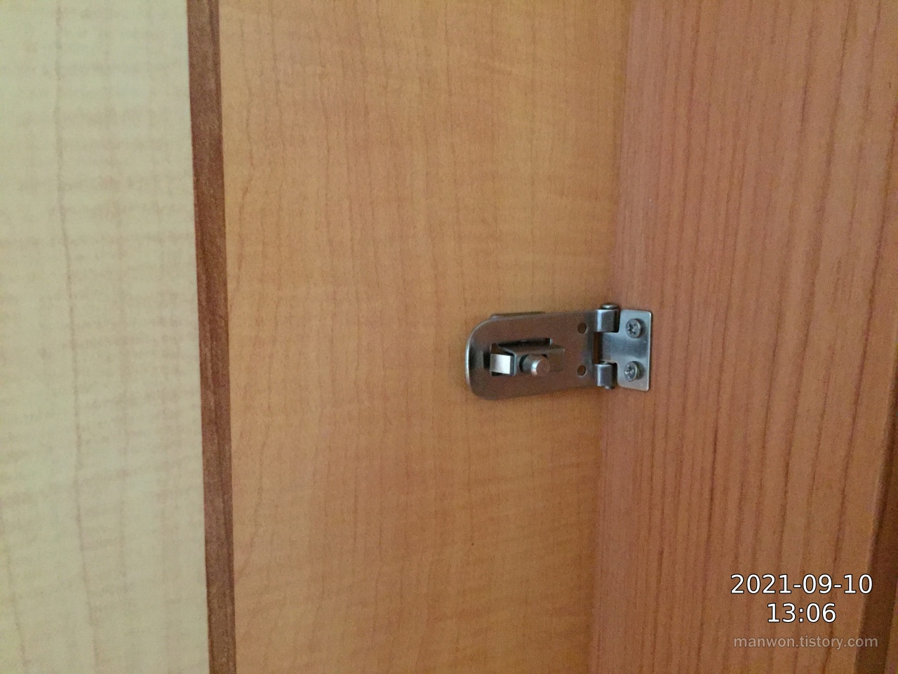 방 자물쇠가 완성된 모습. 이건 따로 열쇠가 필요한 게 아니라 손잡이를 밀면 잠금이 해제되는 식이다. 밤 9시에 잠그고 다음날 새벽 5시에 여는 건 어머님께서 도와주시기로 했다.