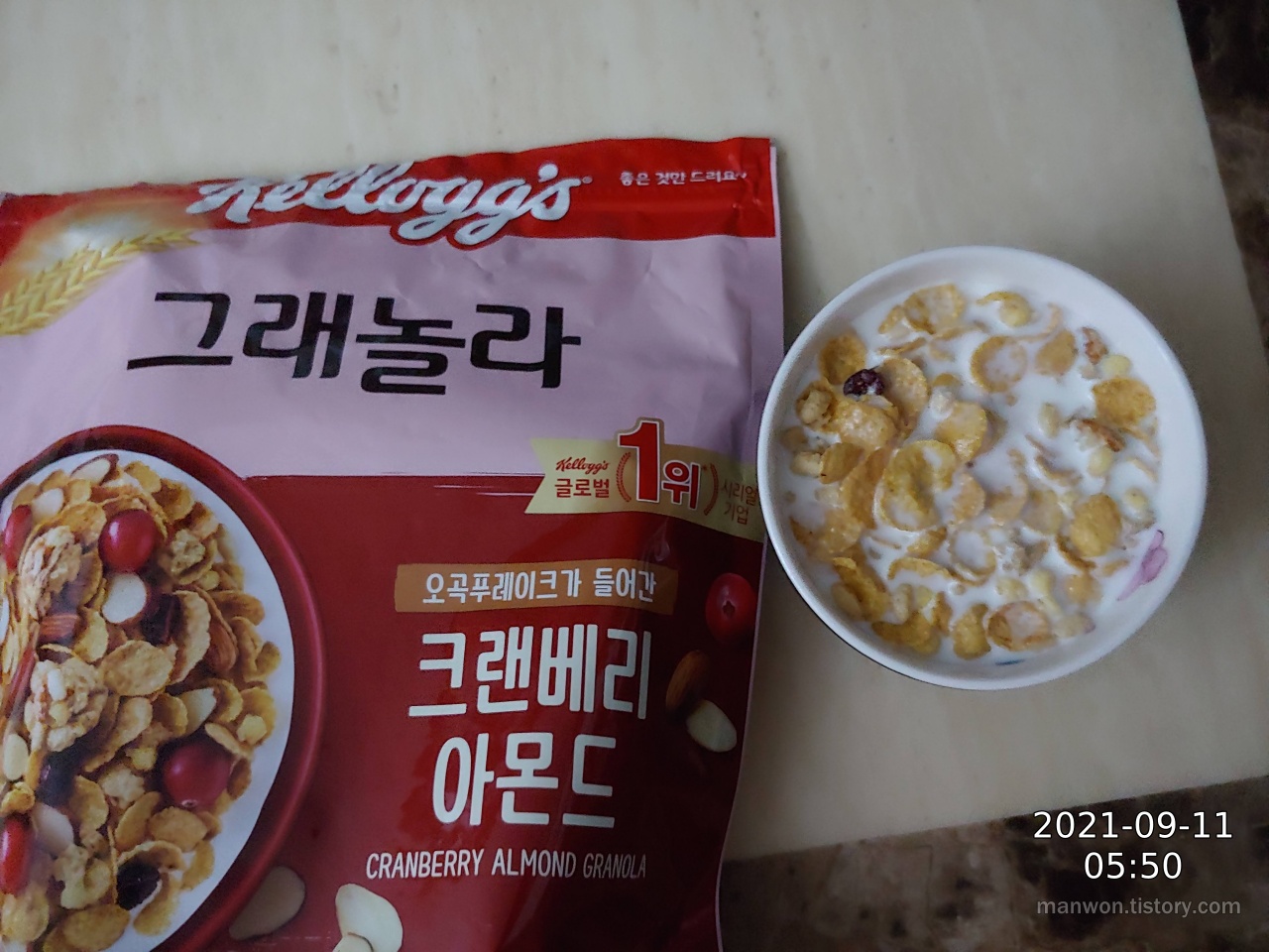 켈로그 그래놀라를 우유에 말아 먹었다. 두 그릇 먹었다.
