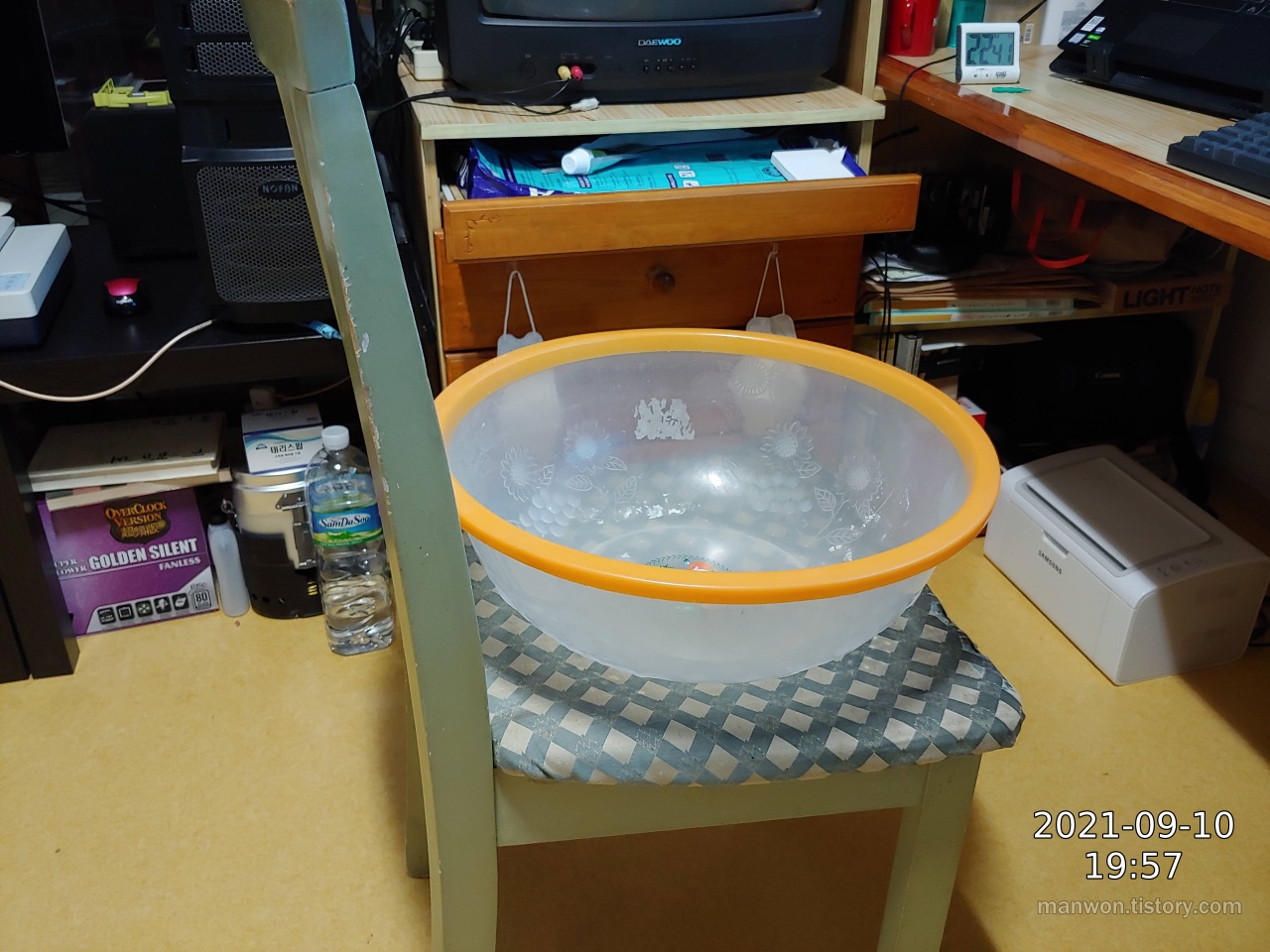 혹시 모를 큰 일에 대비한 플라스틱 대야.