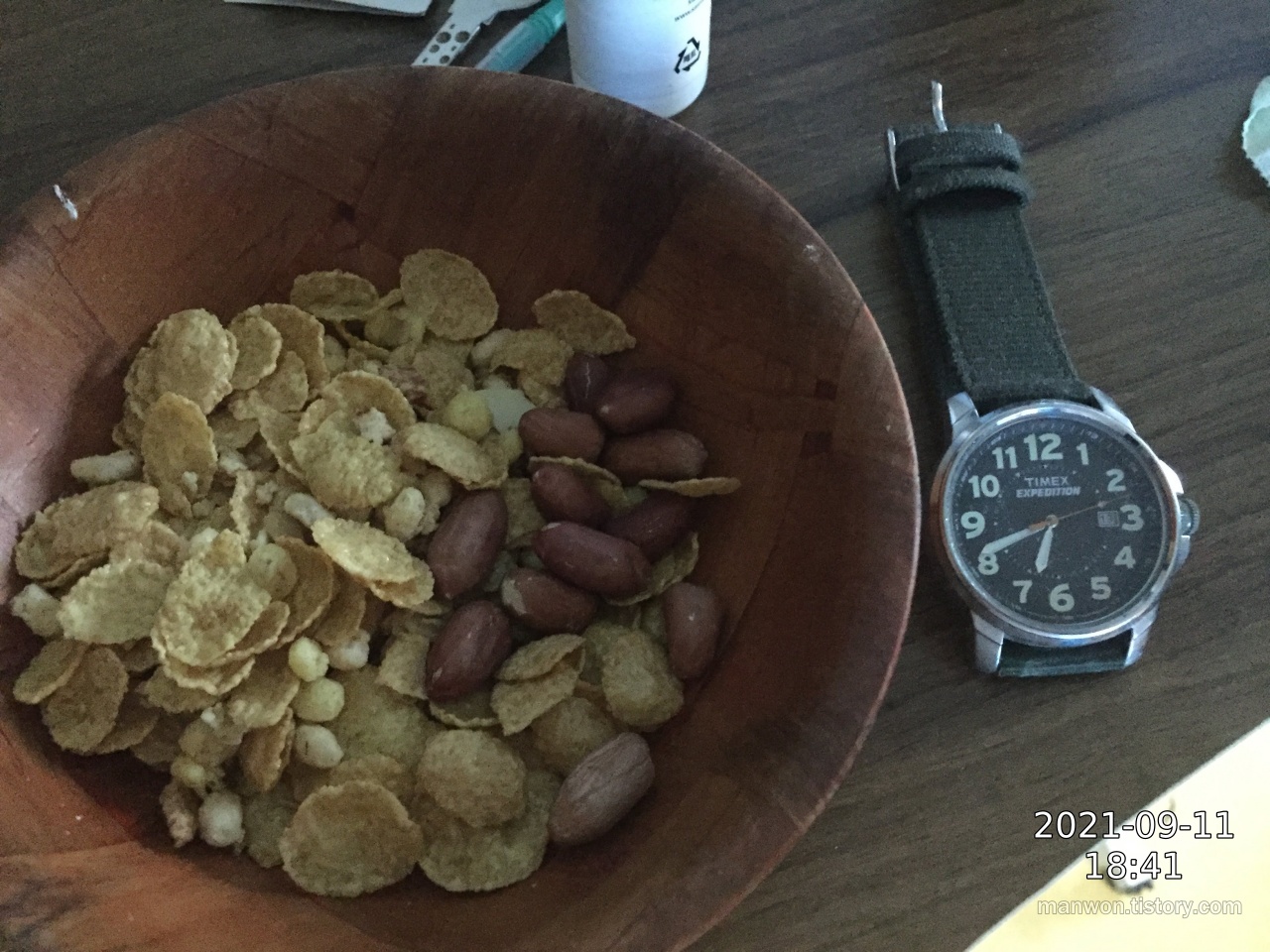 오후 5시 50분 정도에 저녁 식사를 마쳤기에 저녁 6시 40분경에 땅콩과 켈로그 후레이크를 조금 더 먹었다.