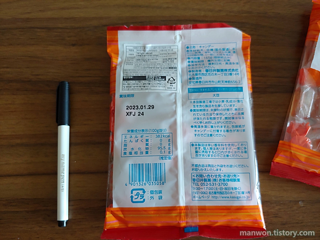 카스가이 계피맛 사탕 뒷면. 유통기한이 2023년 1월 29일까지.