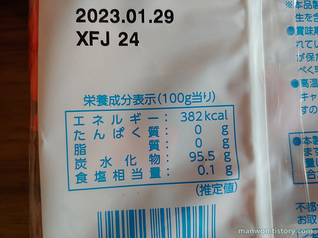 100그램당 382칼로리. 탄수화물은 95.5그램. 그냥 탄수화물 농축 덩어리라 보는 편이 정확할 것 같다.