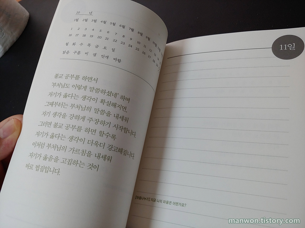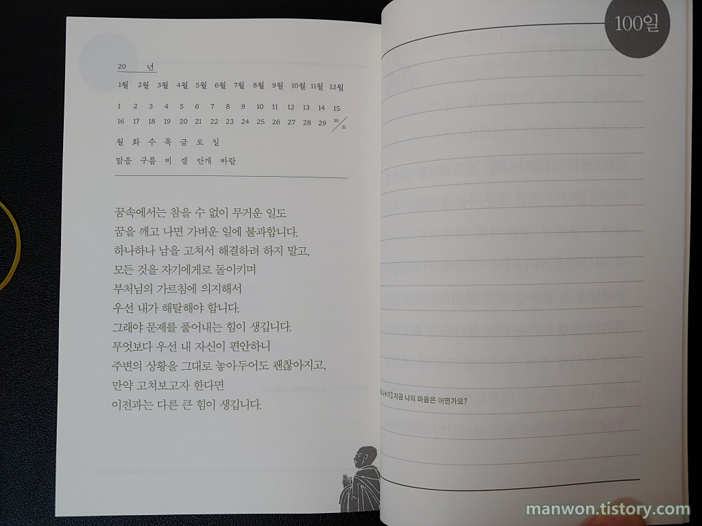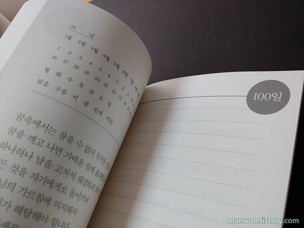 100일 필사 공책은 위 사진처럼 구성되어 있다. 왼쪽 상단엔 년월일과 요일 그리고 날씨를 표시할 수 있고 그 밑엔 한 단락 정도의 문장이 들어가 있다. 오른쪽엔 말 그대로 필사를 할 수 있는 공간이 준비되어 있다.